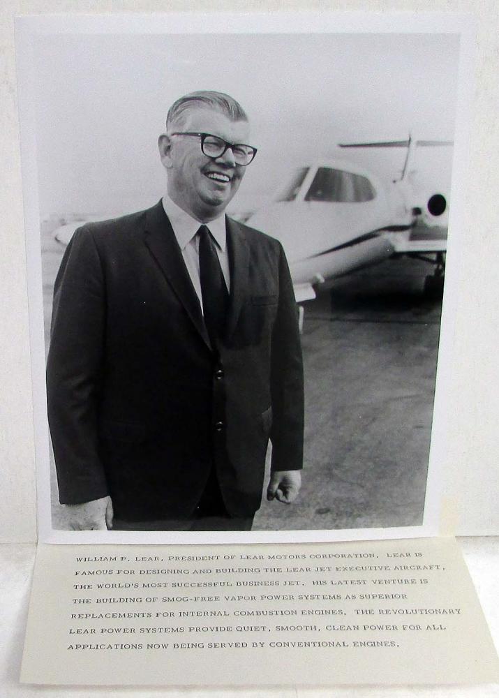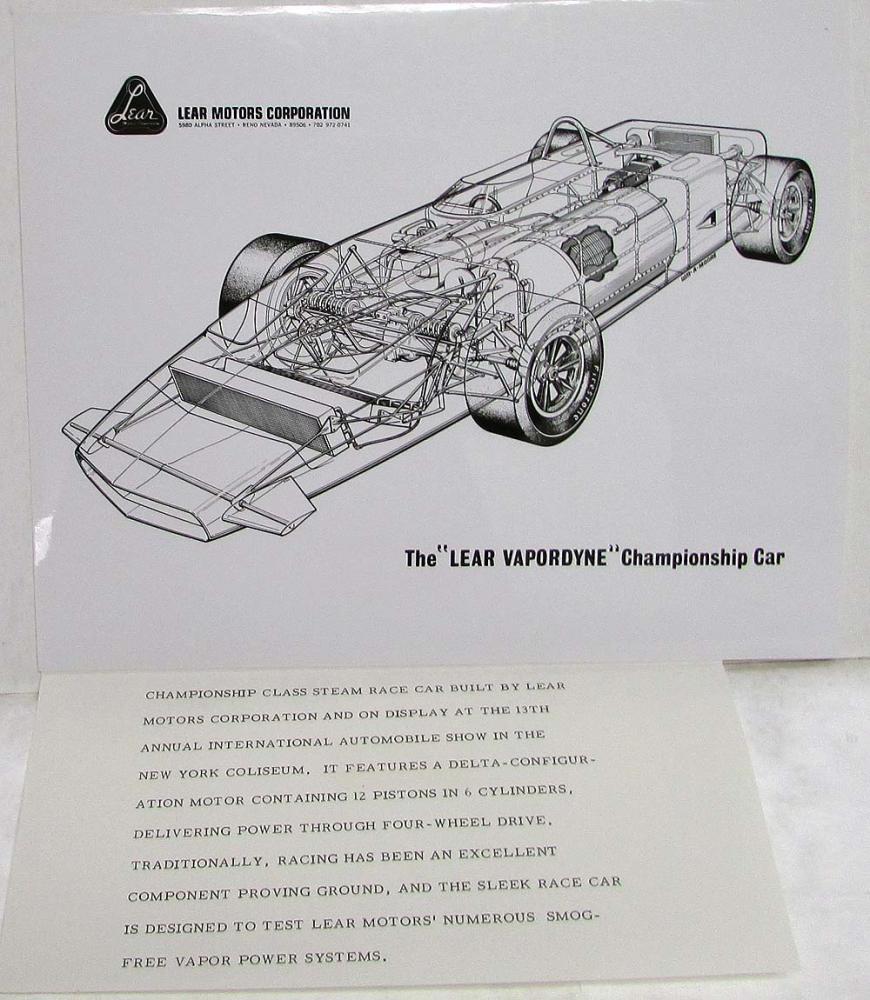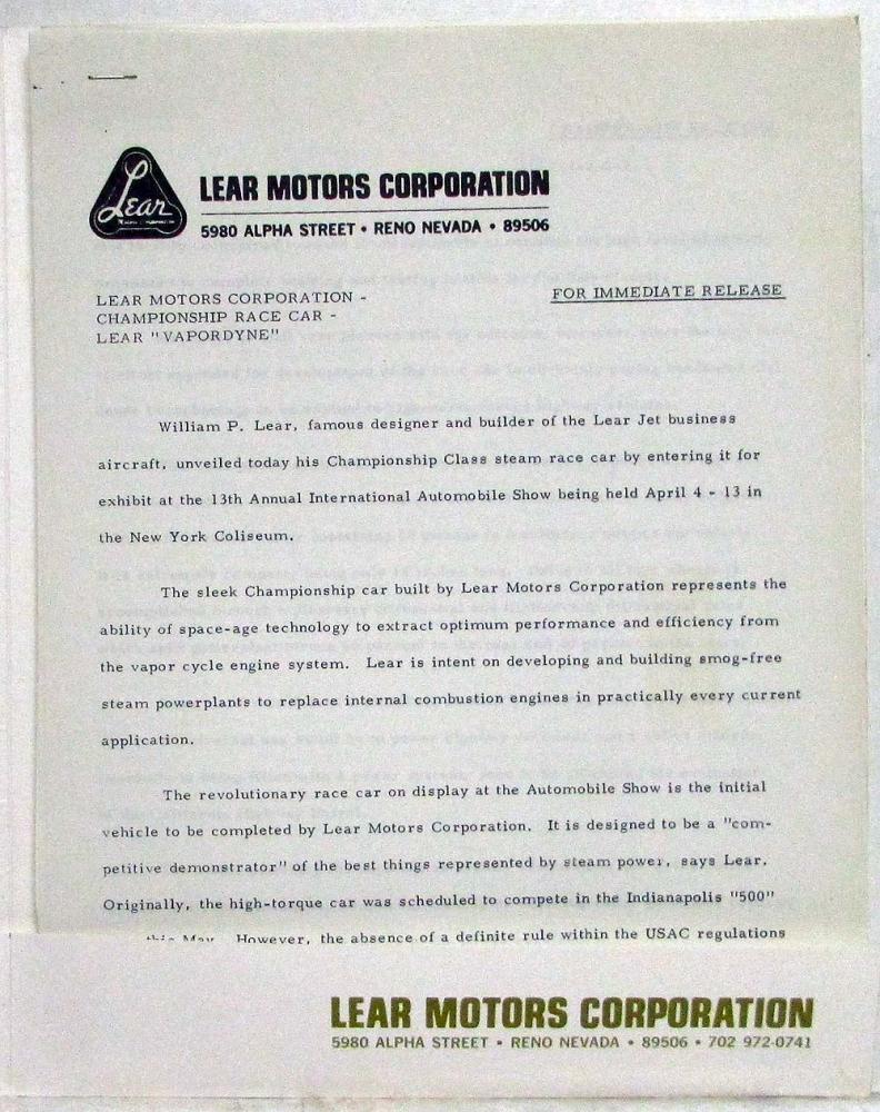 1969 Lear Vapordyne Championship Car (Steam Powered Race Car) Media Information Press Kit from Lear Motors Corporation of Reno, NV. Original.