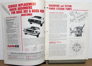 November 1969 Shop Tips from Autolite Ford Vol. 8 No. 3. Technical parts and service information published by the Autolite-Ford Parts Division and distributed by Ford and Lincoln-Mercury dealers to assist servicemen in Service Stations, Independent Garages, and Fleets. Diagnosing and Testing Ford-Design Power Steering Pumps... Plus ... All About Ford's New Column-Mounted Ignition Switch and Electronic Distributor Modulator. Index: Service Replacement Shock Absorbers for Boss 302 and Boss 429, Diagnosing and Testing Power Steering Pumps Description and Operation, Cleaning and Overhaul Precautions, Three Basic Problems, External Leakage, Pump Noise Diagnosis, Insufficient Pump Pressure (Testing), Specifications, Servicing Ford's new Column-Mounted Ignition Switch, Testing Ford's New Electronic Distributor Modulator. Good condition with minor wear and soiling [see photos].
