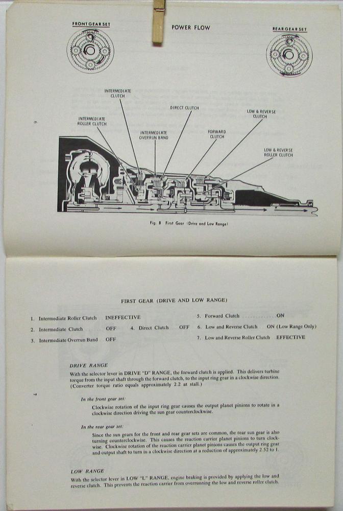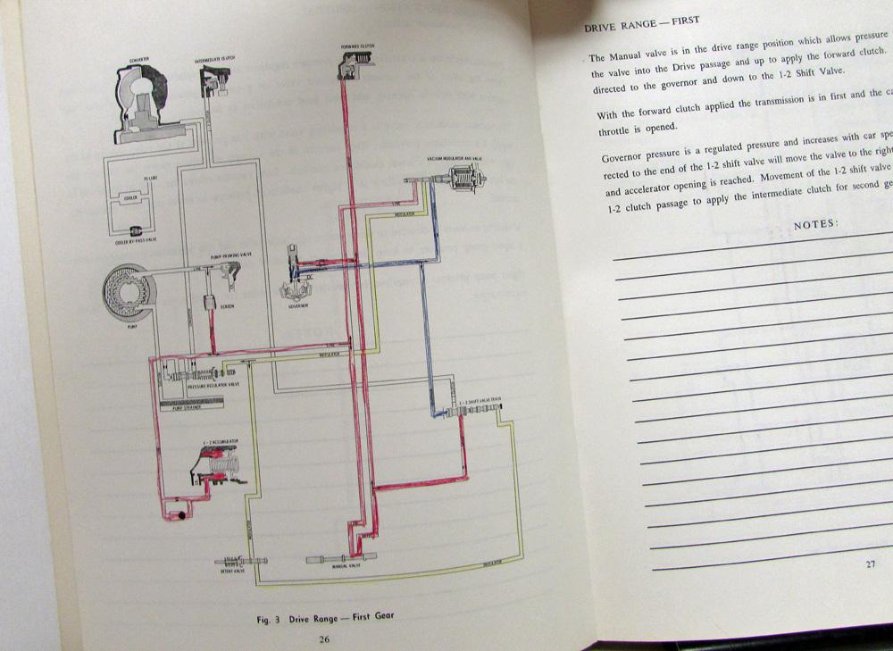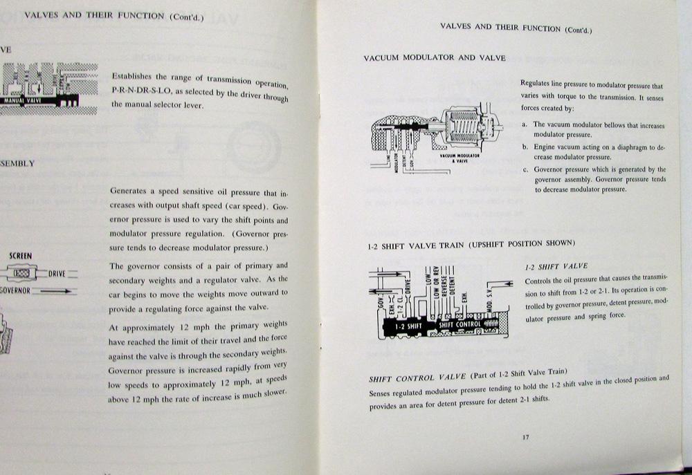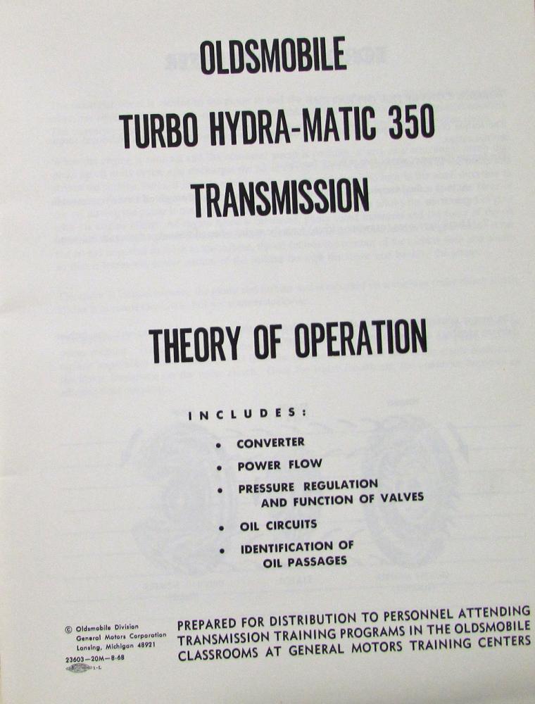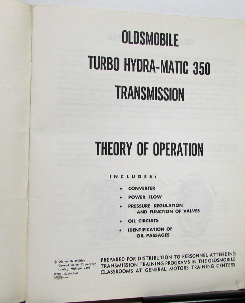 Original, 1969 Oldsmobile Turbo Hydra-Matic 350 Transmission Theory of Operation Technician Reference Manual No. 908. Prepared for service technicians in the classroom setting. Covers converter, power flow, pressure regulation and function of valves, oil circuits, and identification of oil passages. Cover is lightly soiled and on some of the diagrams someone has traced a link with red pencil. No writing in the book. Otherwise, very good condition.