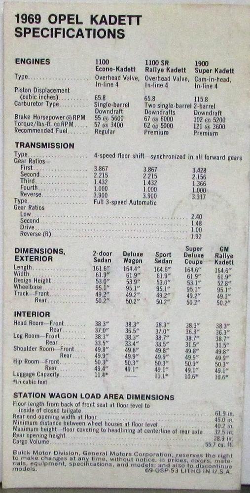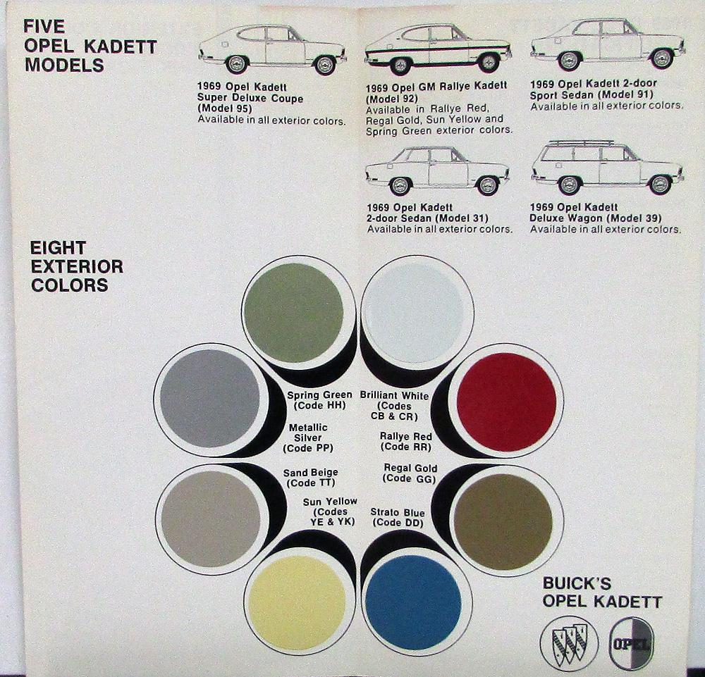 Original 1969 Opel Kadett (by Buick) exterior colors, models and specifications sales folder. Diagram of the five available models. Eight color paint chips. Specifications for the 1100 Econo-Kadett, 1100 SR Rallye Kadett, and 1900 Super Kadett. Station wagon load dimensions. Fair condition. Insdie clean. Outside lightly soiled.
