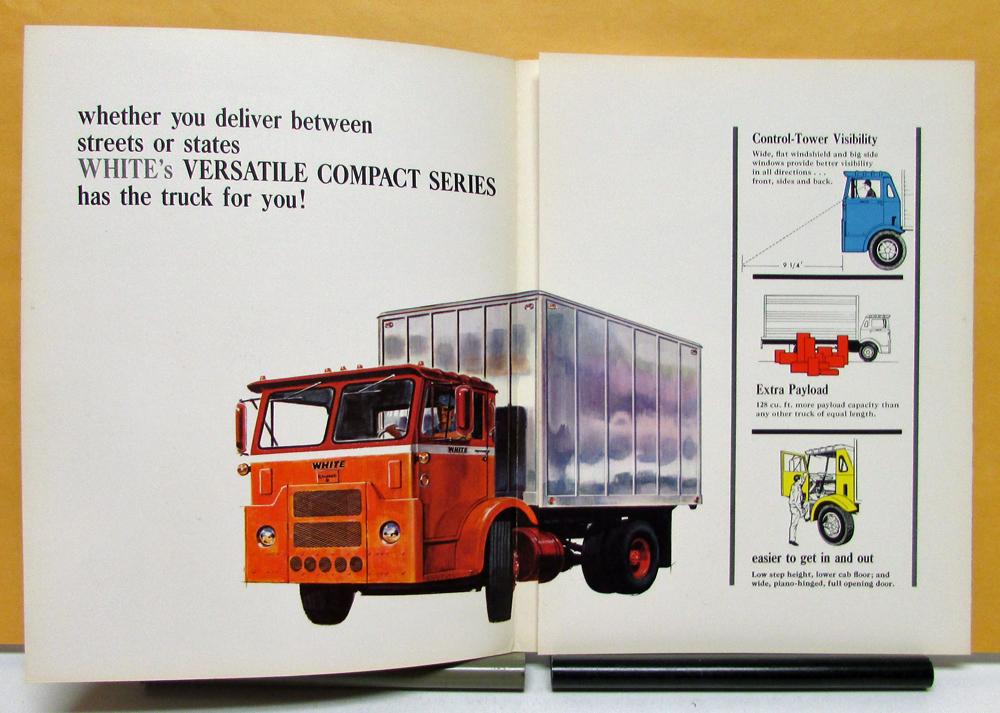 1969 White Truck "White Compacts...proved flexibility for lowest cost operation" Sales Folder. Front page has several good pictures of the Compact in operation. The other pages has illustrations and pictures of the truck along with information on features.