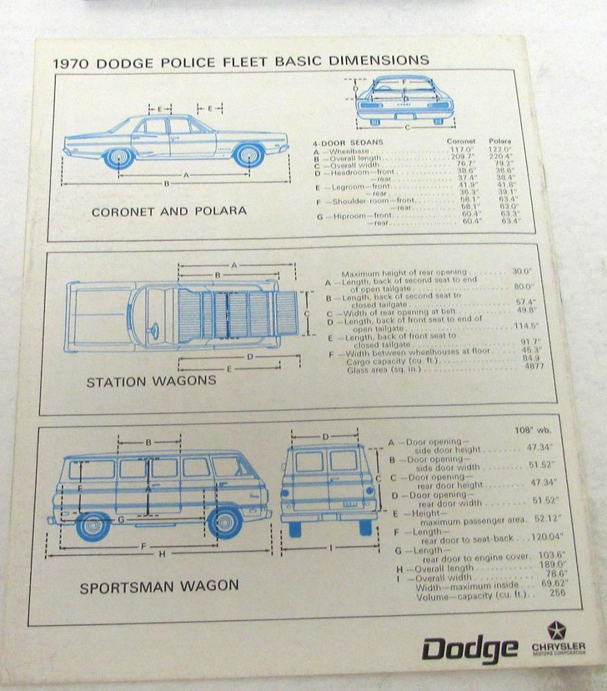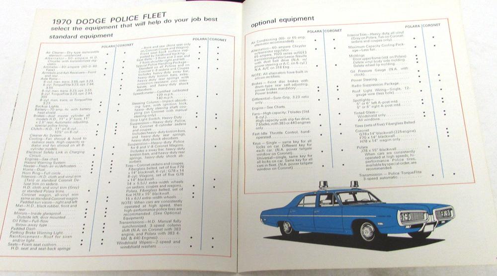 Original 1970 Dodge Polara, Coronet, Wagon, Sportsman & A100 Vans Police Pursuit sales brochure, 8 1/2 x 11, 16 pages.