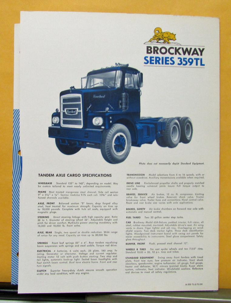 1970 Brockway Truck Model 359TL Tandem Axle Tractor Sales Folder & Specifications. The front page has an illustration of the tractor. The other pages have information on features and specifications along with a nice picture/illustration of the tractor.