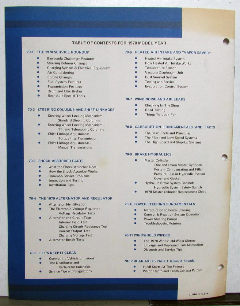 1970 Chrysler Plymouth Dodge Dealer Master Technician Service Conference Reference Book [70-12]. These Master Tech Bulletins were sent to Dealers to educate Service Staff on updated Service Tips and Techniques. This edition covers Rear Axle [Part I] on 1970 Models. The back cover has a Table of Contents for the 12 Service Bulletins for 1970. It is in good condition with minor wear and soiling [see photos].