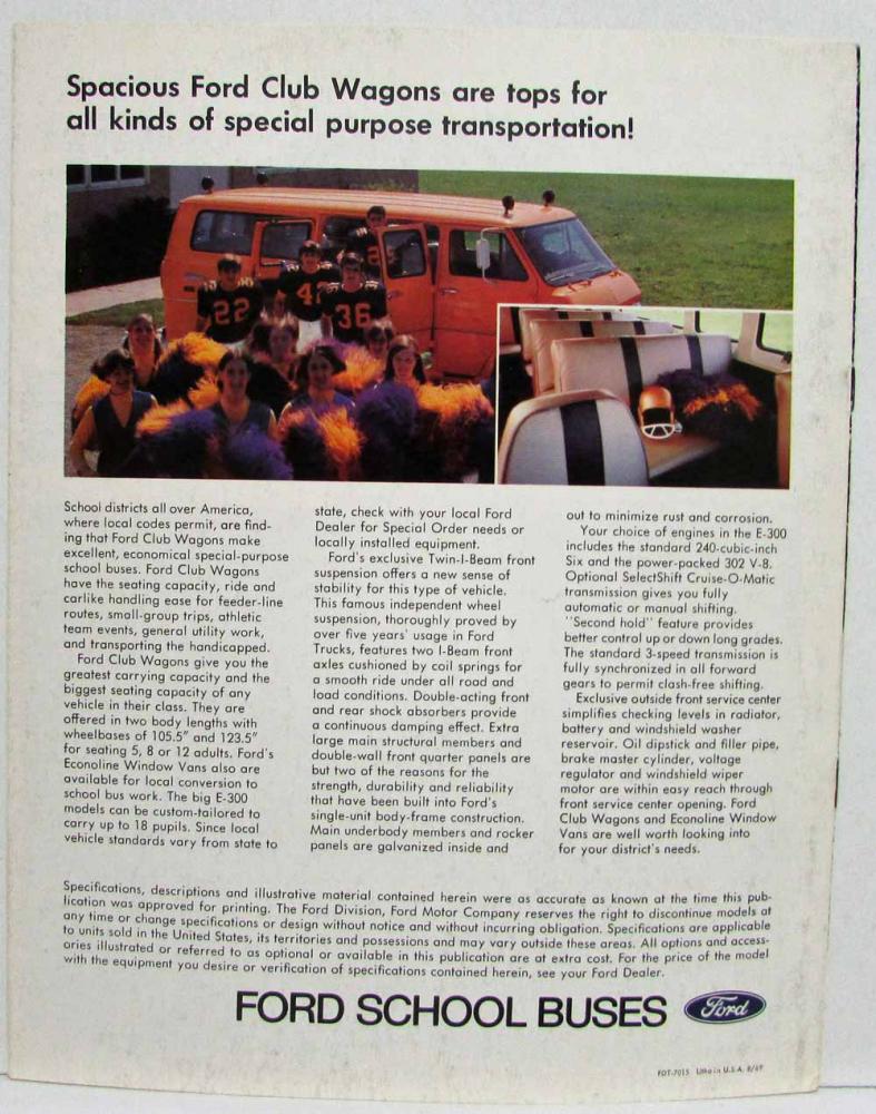 1970 Ford Trucks School Bus Chassis B-Series B-500 B-600 B-6000 B-700 B-7000 B-750 Sales Brochure. Lists important points to consider before buying a school bus. Ford chassis meet every school bus need. All major bus body builders install bodies on Ford chassis. Ford school bus chassis match or exceed all NEA requirements. Greater driving ease and maintenance convenience. Choose from nine proven engines...gasoline or Diesel. Features a power train selector as well as a component selector and specification guide. Back features Ford Club Wagons for special purpose transportation. Condition: Rust on staples. Some soiling. See pics.