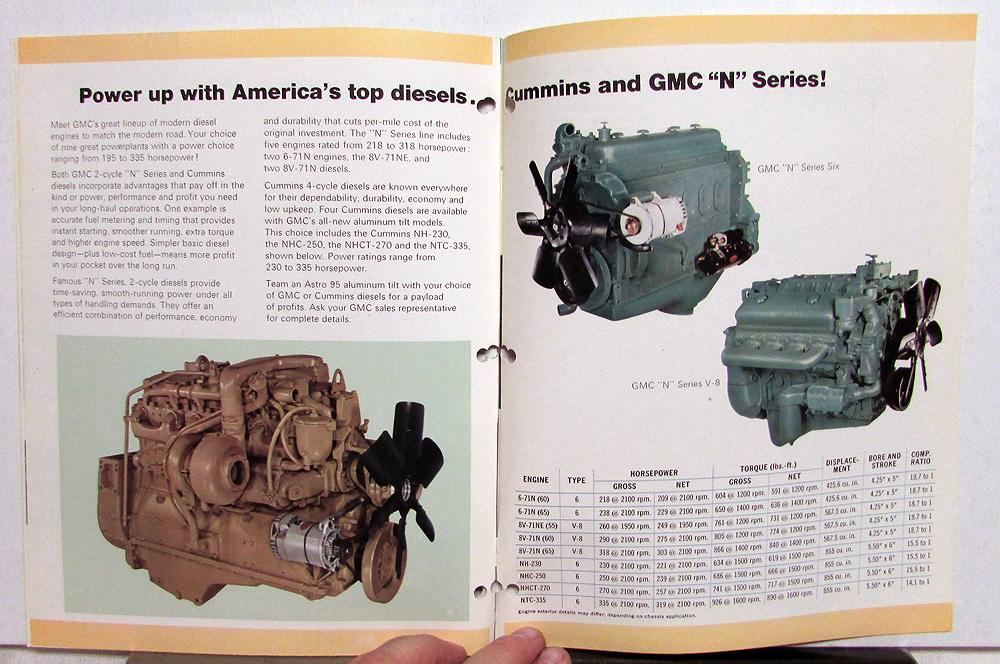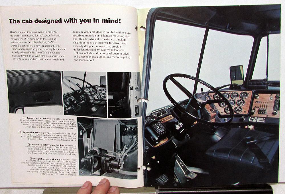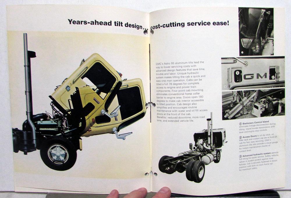 1970 GMC Trucks Astro 95 Sales Brochure. The truck people from General Motors. Move more goods further--faster--with GMC's all-new aluminum tilts. The cab designed with you in mind. Advanced design cab features save time--save cost. Workhorse chassis shrugs off the miles. Years-ahead tilt design...cost-cutting service ease. Power up with America's top diesels...Cummins and GMC "N" Series. Specifications at the back of the brochure. Good condition with minor wear and soiling [see photos]. Spine has holes punched for a binder.