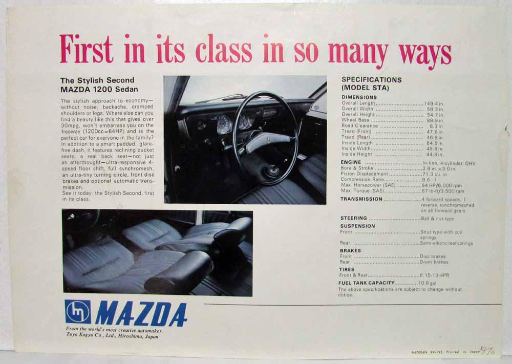 1970 Mazda The Stylish Second 1200 Sedan Spec Sheet. Condition: Small tear about 3/4 the way up on the left hand side.