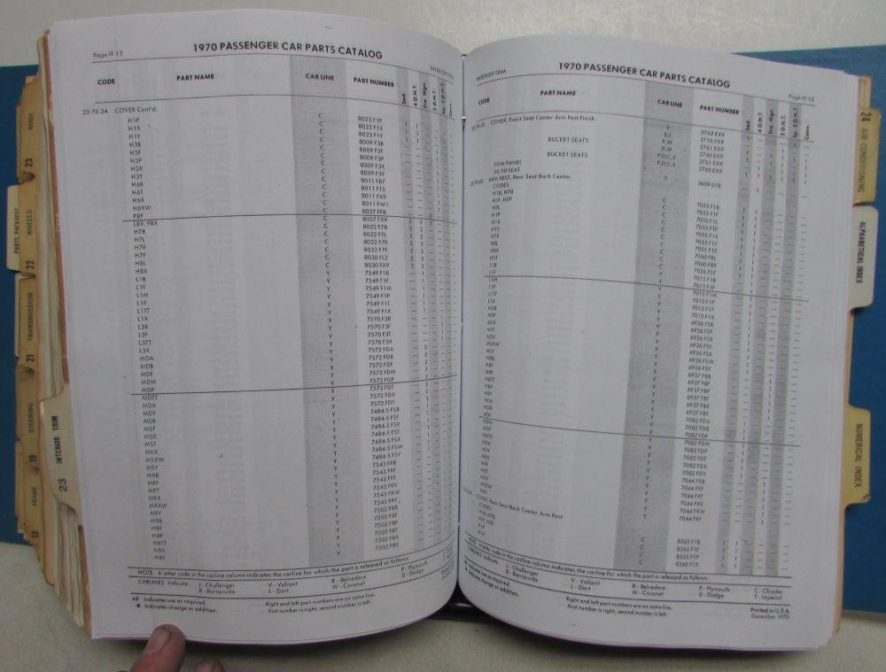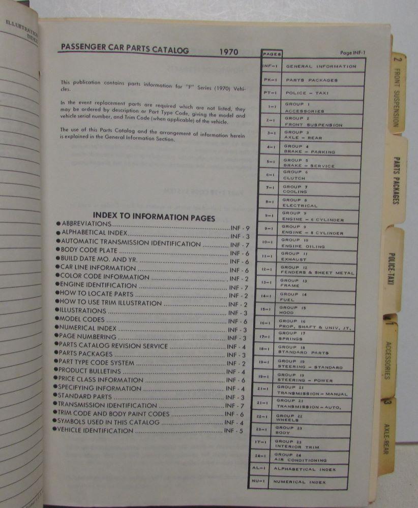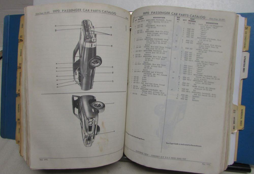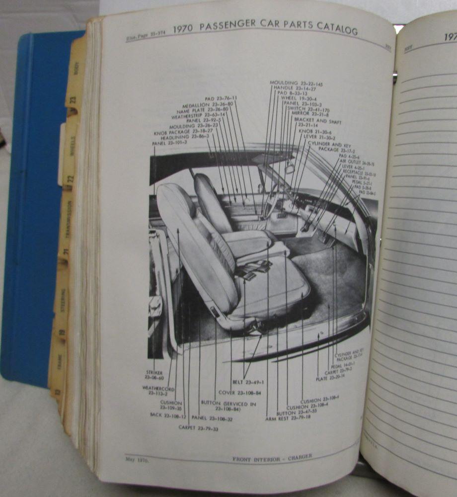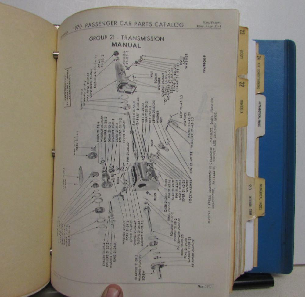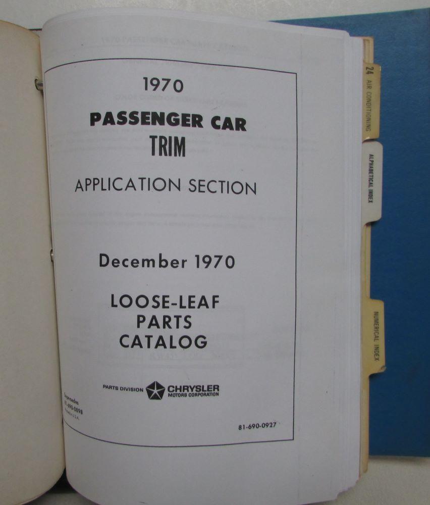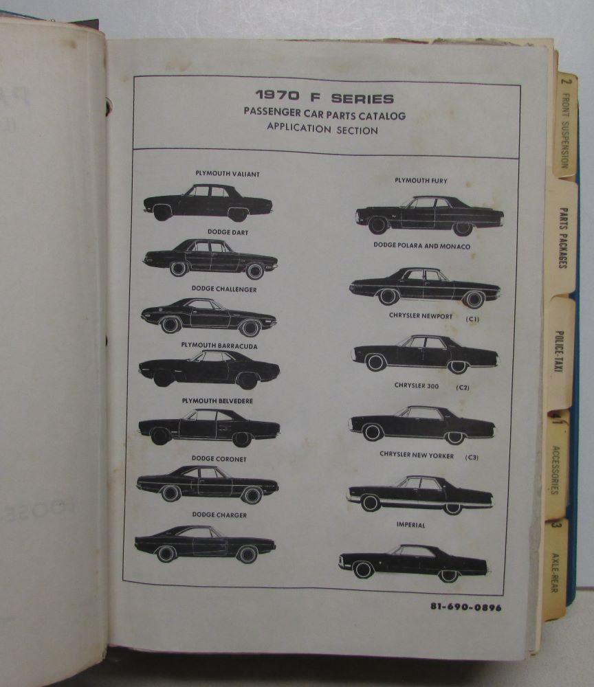 - Original 1970 Chrysler, Plymouth, Dodge dealership parts book. This is the manual the dealership used to look up and order parts for ALL 1970 model cars. This manual is invaluable for identifying NOS Parts and just general information. This has the correct Chrysler Parts binder that would be correct for this time frame, with correct tabs for each section. Sections include: