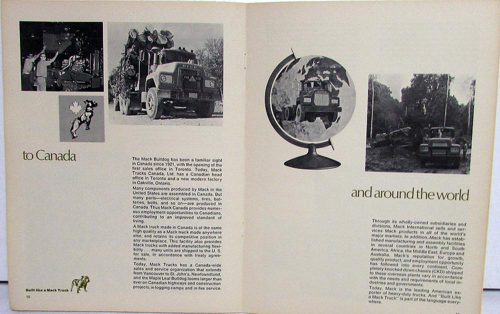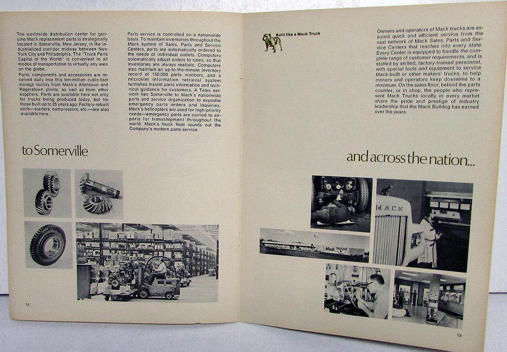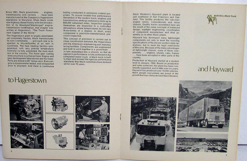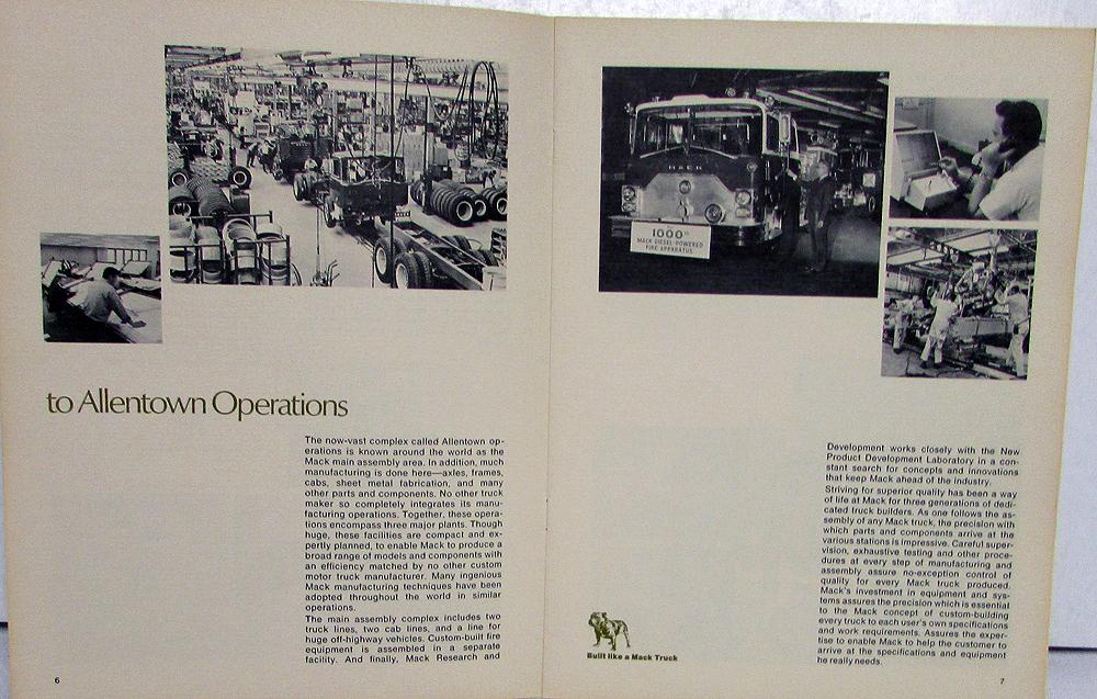 Original Mack Trucks, Inc history and facilities brochure/booklet. I'm guessing this was compiled in the early 70's ,but, this is a guess on my part. Includes a welcome letter from 2 Mack executives, Info about the World Headquarters, Allentown Operations, Hagerstown, Hayward, to Canada and around the world and to Somerville and across the nation. No substitue for Mack experience and Mack quality. Good condition