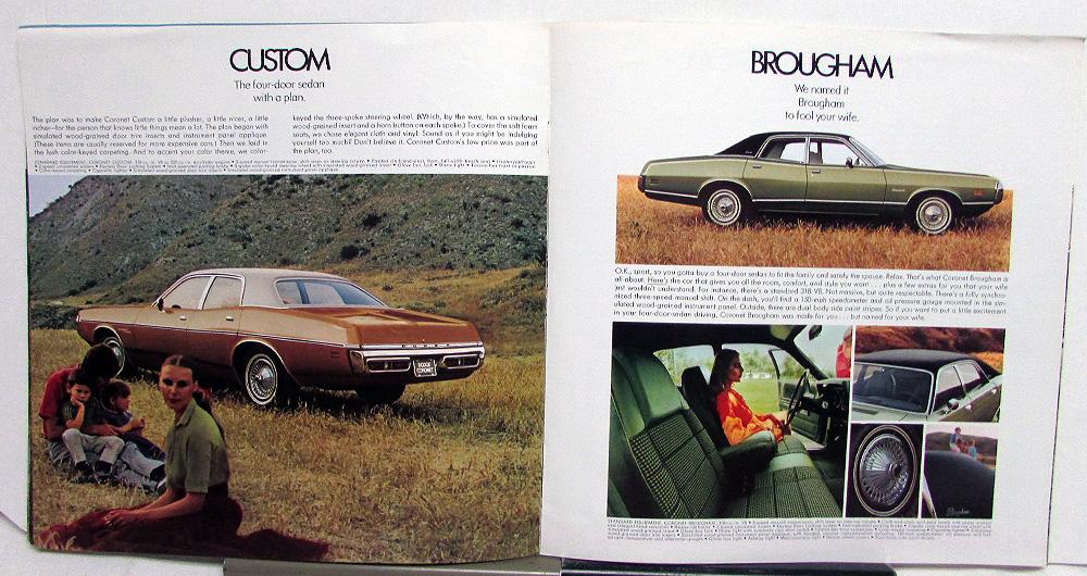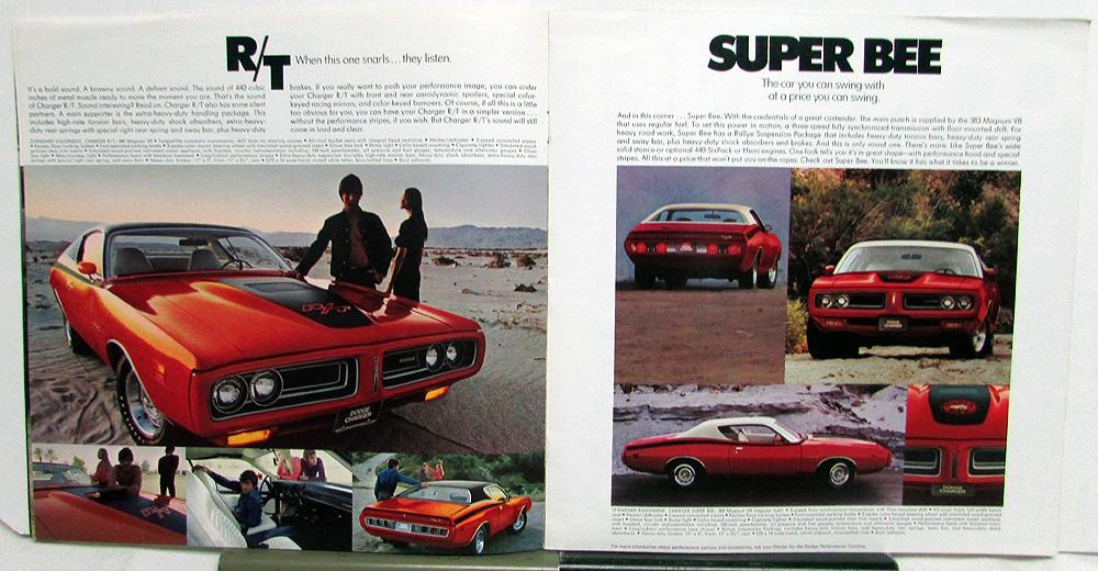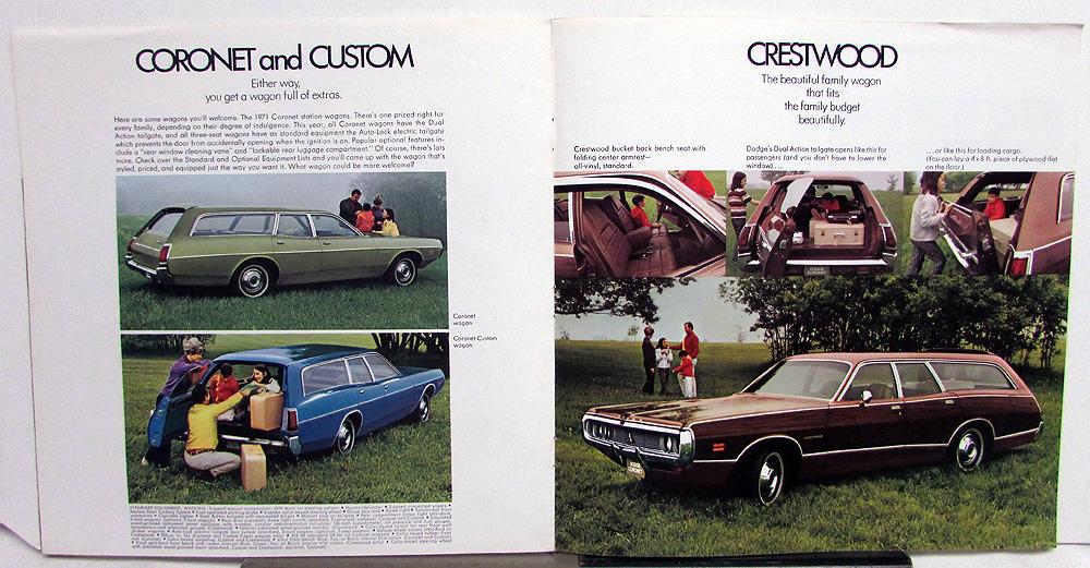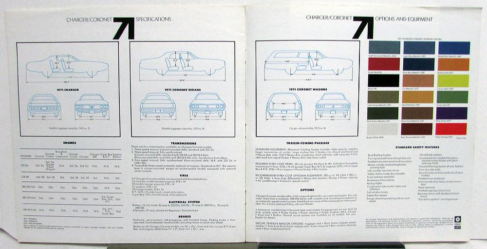 Original, over-sized, color sales brochure by Dodge for the 1971 Charger and Coronet. List standard equipment of each model listed*, engines, transmissions, dimensions, color chart, standard safety features, etc. * Charger and Coupe, 500, SE, R/T, Super Bee, and Coronet and Custom, Brougham, and Coronet & Coronet Wagon and Crestwood wagon. Good condition with minor wear, blemishing and discoloration [see photos].