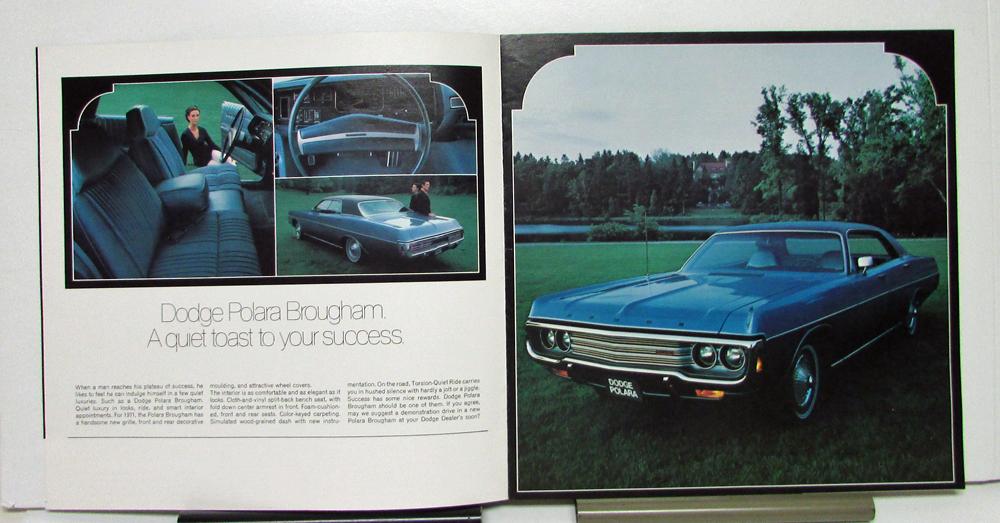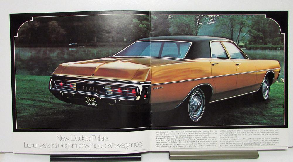 1971 Dodge Polara, Monoco and Station Wagons Sales Brochure & Specifications. The front page has a picture of the Dodge Polara. The inside pages have pictures of each of the models along with descriptions on features. There are also interior views on the inside pages. The last two inside pages have specifications and exterior color choices.