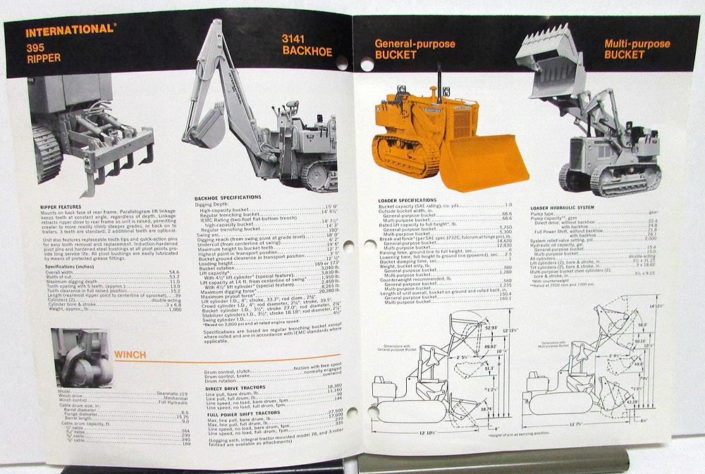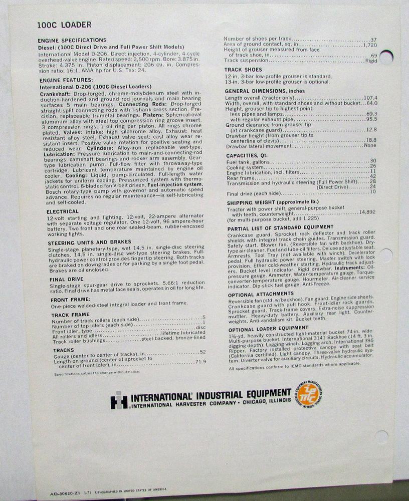 Original 1971 International Dealer Sales Brochure. This IH Industrial Equipment Brochure highlights the 100C Loader Tractor. It is in very good condition with minor wear [see photos]. The front cover has pricing notations on top. AD-30620-Z1