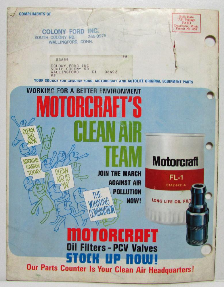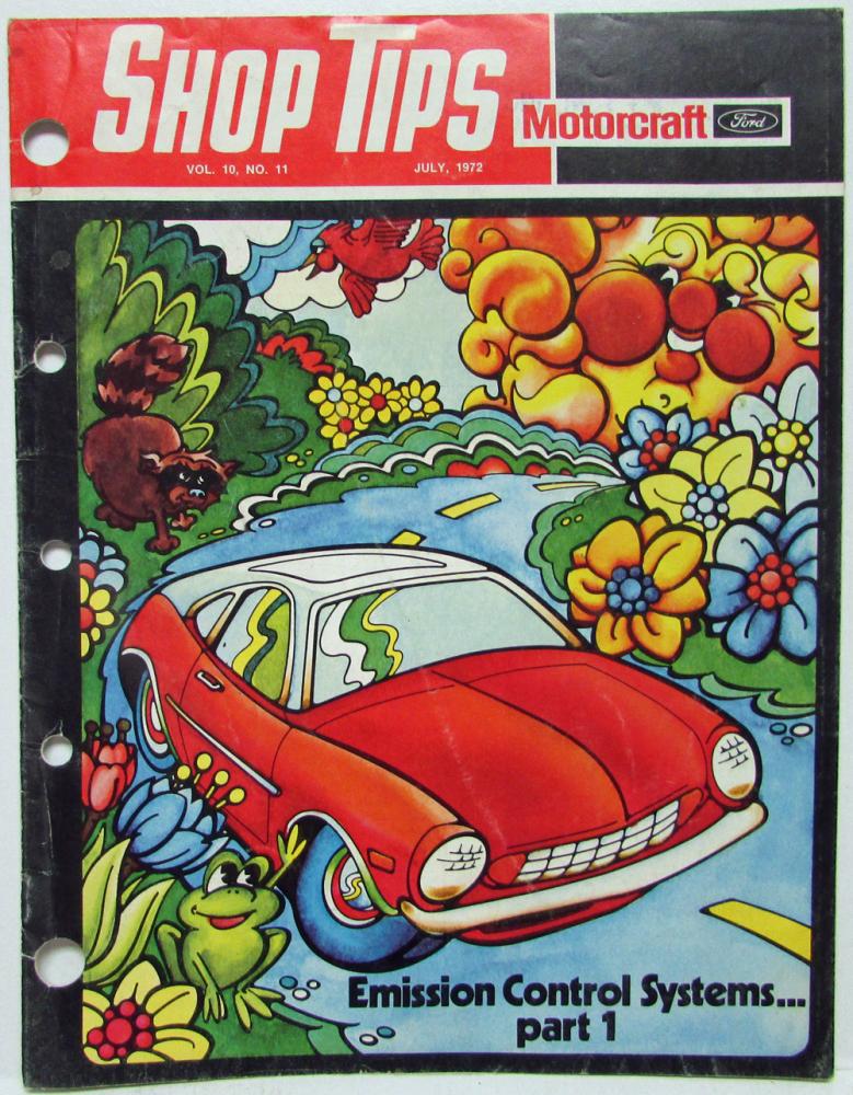July 1972 Shop Tips from Autolite Ford Vol. 10 No. 11. Technical parts and service information published by the Autolite-Ford Parts Division and distributed by Ford and Lincoln-Mercury dealers to assist servicemen in Service Stations, Independent Garages, and Fleets. Emission Control Systems... Part 1. Index: Emission Control Systems, Part 1, Warranty Service Requirements, Introduction-IMCO, Inlet Air Temperature Regulation, Thermostat Operated Type, Vacuum Operated Type, Idle Limter Caps, Idle Speed Throttle Solenoid, Choke Pulldown System (Staged), Decel Valve, Dual Diaphragm Vacuum Advance, Distributor Vacuum Control Valve, Spark Delay Valve, TRS System - Operation, Diagnosis and Testing, TRS Diagnosis Chart. Condition: Tear in last few pages. See pics.
