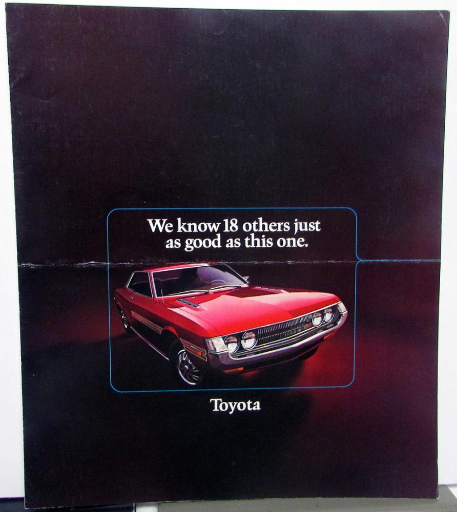 1972 Toyota We Know 18 Others Just as Good Full Line Sales Folder. Features Toyota Corolla, Carina, Land Cruiser, Half-ton pickup, Corona, Mark II, Celica ST, and Crown. Specifications on back. Good condition with minor wear and a crease across middle from being folded [see photos].