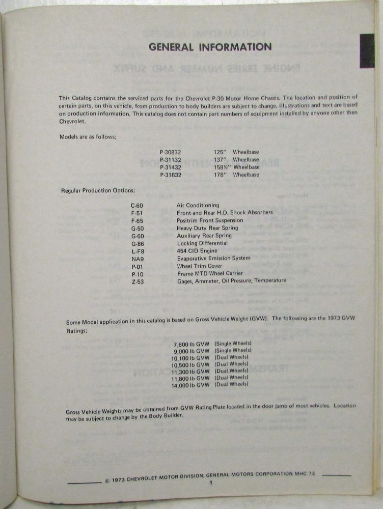 This Catalog contains the serviced parts for the Chevrolet P-30 Motor Home Chassis. The location and position of certain parts, on this vehicle, from production to body builders are subject to change. Illustrations and text are based on production information. This catalog does not contain part numbers of equipment installed by anyone other then Chevrolet.