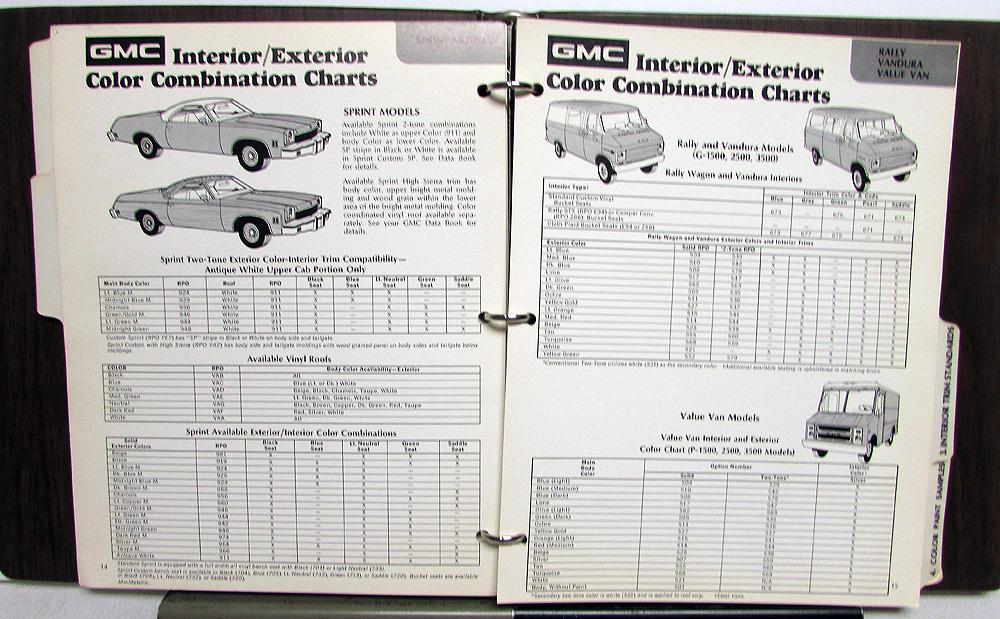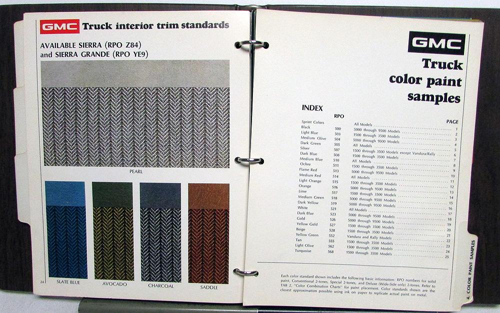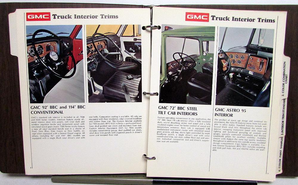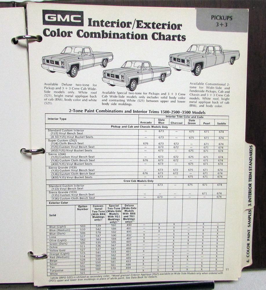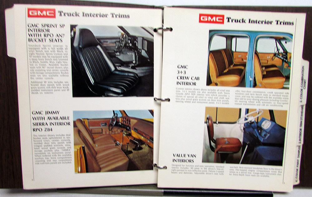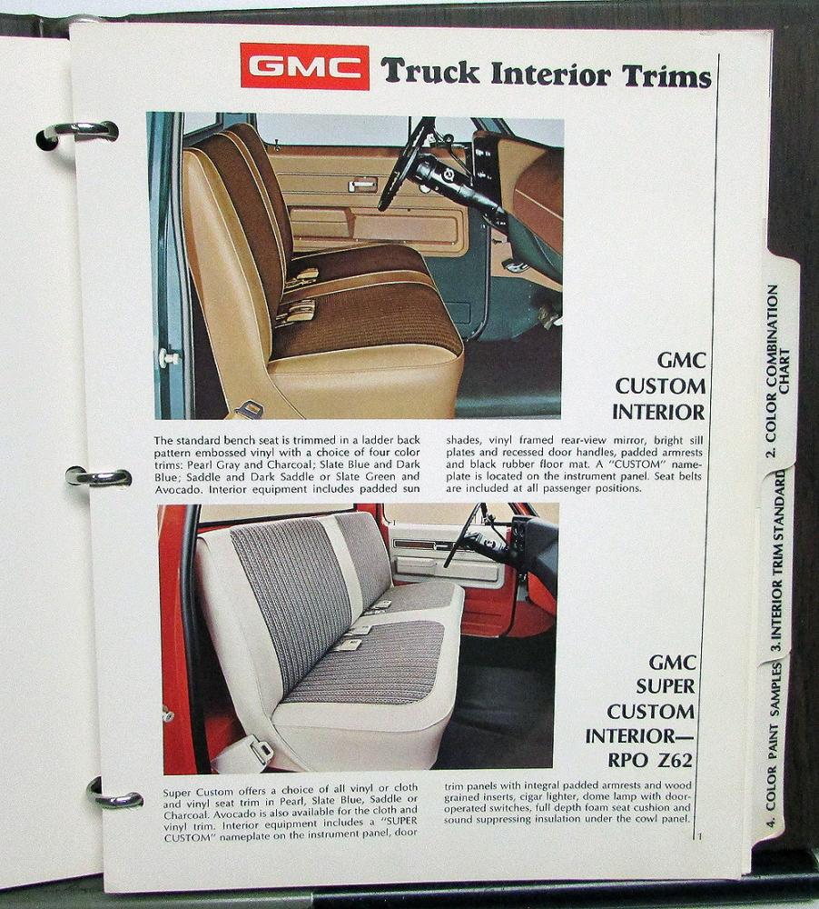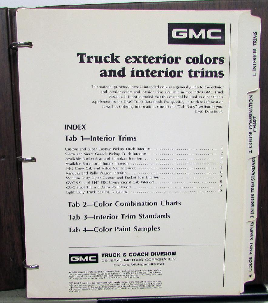 Original 1973 GMC Truck Dealer Color & Trim Book. This Sales Reference Album covers the Full Line of GMC Trucks including Pickups,Vans, Medium and Heavy Duty Models. This was used by Salesmen to help Customers make their purchase. It shows the interior and exterior color options along with having Fabric options and Color Paint Chips. It is in the original binder and is in good condition with minor wear, blemishing and soiling [see photos]. Very rare and informative Dealer Only item that will display well.