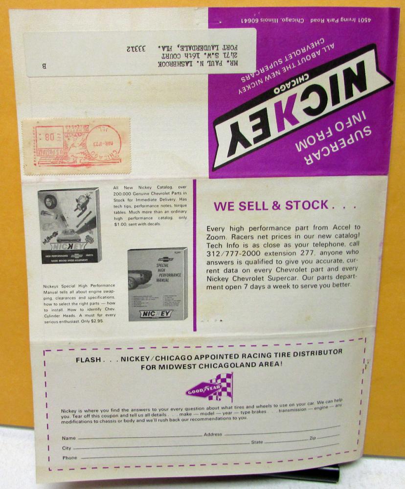 Original 1973 Nickey Chevrolet Dealer Sales Brochure/Mailer. This Brochure highlights the High Performance Cars and Equipment that were available from this Legendary Chicago Dealer. They made modified H/P versions of Camaro's, Nova's and Chevelles. It is in good condition with minor wear and soiling. There are 2 creases where it was folded to make the Mailer. Very rare and cool piece of automotive history that will display well.