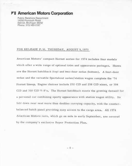 1974 AMC Hornet Hatchback and 2-Door Sedan Press Photo and Press Release.