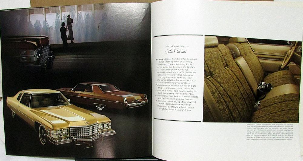 Original, over-sized, prestige, color, sales brochure for the 1974 Cadillac featuring Fleetwood (Brougham, Seventy-Five, d'Elegance), Eldorado (Cabriolet, Convertible), DeVille Series (Sedan, Coupe, d'Elegance, Cabriolet), and Calais Series (Sedan, Coupe). Includes descriptions, standard and optional features and equipment, and specifications. Colorful photos of exteriors and luxurious interiors. Printed for Lubik Cadillac. Raised embossed logo and text on front cover. Very, very lightly soiled on cover. This is the larger version of the two brochures.