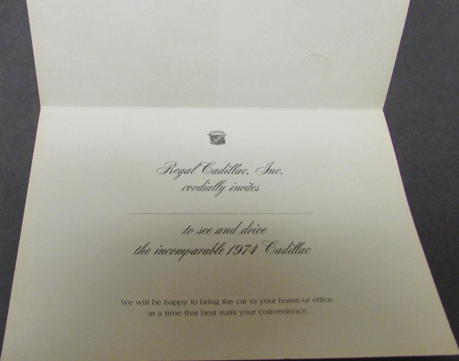 1974 original, Cadillac An Invitation...to test drive... Printed on one piece of glossy cardstock, two sides, with one centerfold. Paper has yellowed through the year. Thumbnail in card to hold a business card. Good, clean condition.