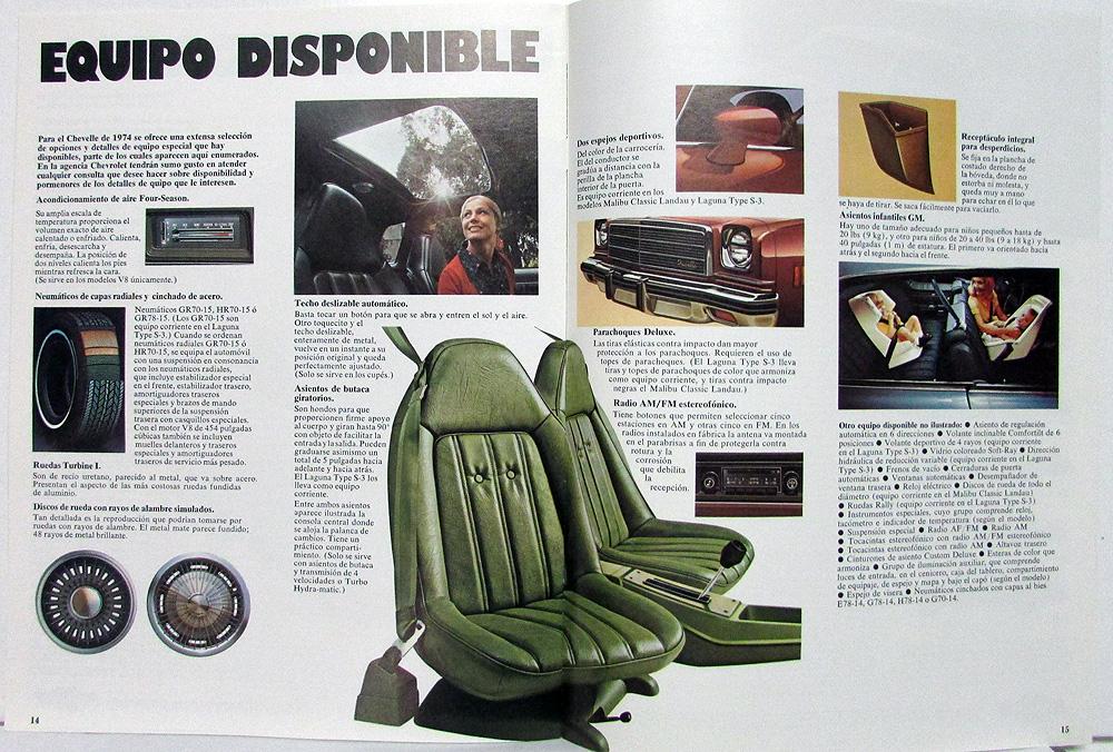 Original, 1974 Chevrolet Chevelle (Malibu Classic, Malibu, and Laguna Type S-3) color, SPANISH TEXT sales brochure in very good condition. Covers interiors, standard and optional features/equipment. Lots of photos.