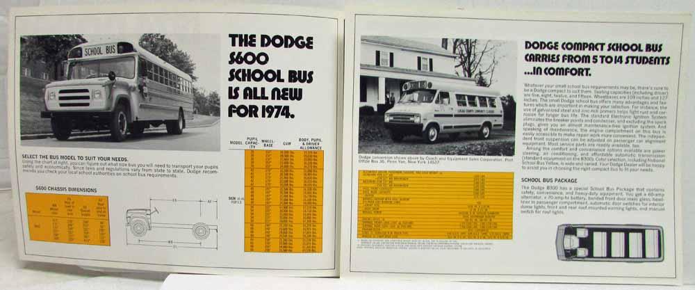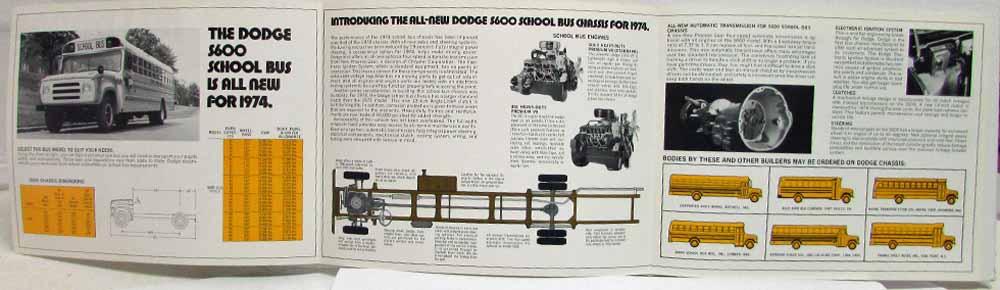 1974 Dodge Trucks School Bus Chassis Sales Folder. Covers the S600 model. Highlights updates to the previous years model, such as all-new automatic transmissions, electronic ignition system, steering updates. 318-3 Premium V8 and 361 Heavy Duty Premium V-8 engines available. Displays illustrations of some bodies available for the buss chassis. Mentions Dodge B300 with special bus package for special school bus needs. Specifications on back.