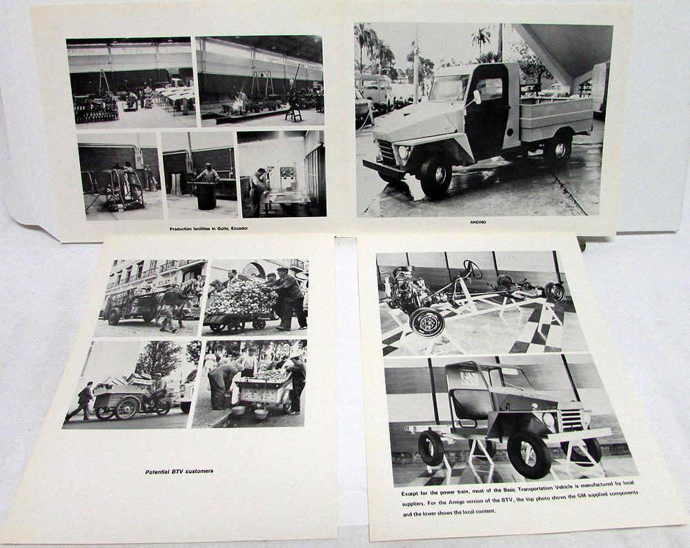 Original 1974 GM Press Kit. This Media Release has the original Folder with Photos and Information Sheets that highlight the BTV [Basic Transportation Vehicle] for the overseas market. Very rare and informative piece of automotive history that will display well. Good condition with minor wear and soiling.