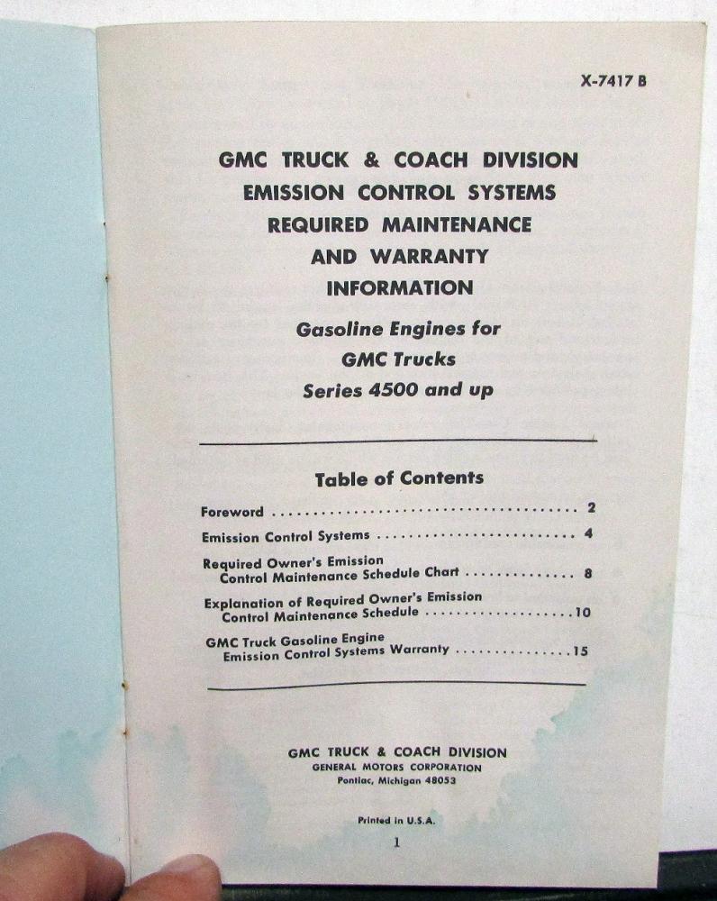 Original 1974 GMC Truck & Coach Division Emission Control Systems Required Maintenance and Warranty Information Booklet. This Booklet would have been with the Owner's Manual when you picked up your new Truck. It covers the Gasoline Engines for Series 4500 and Up Trucks. The bottom half of booklet has minor water staining and blemishing [see photos].