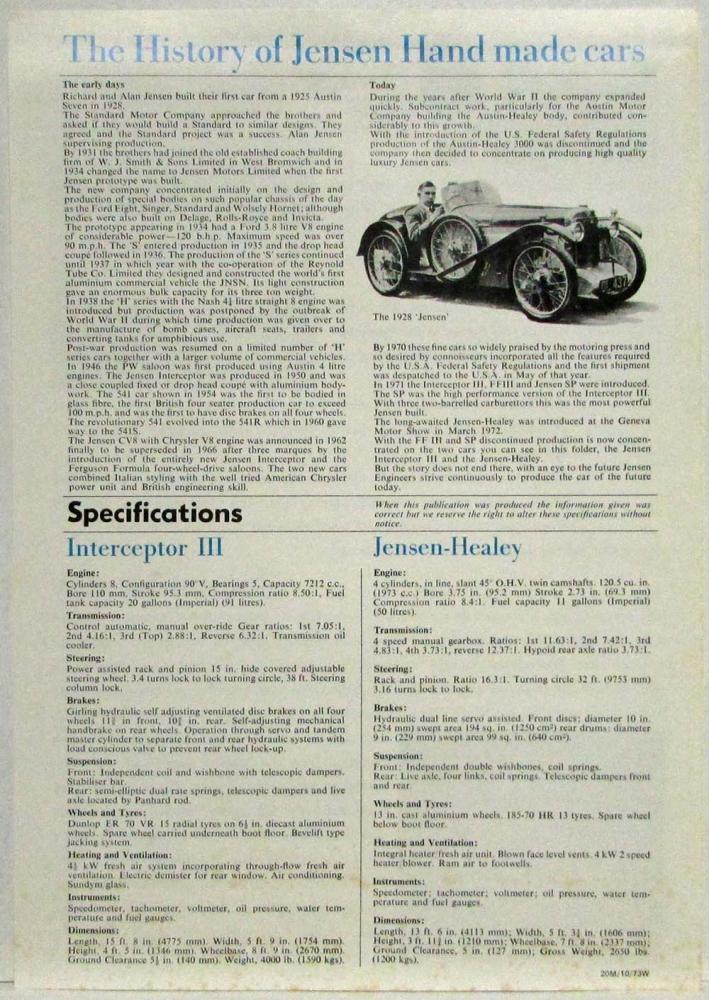 1974 Jensen Interceptor III and Jensen-Healey Sales Spec Sheet. Original.