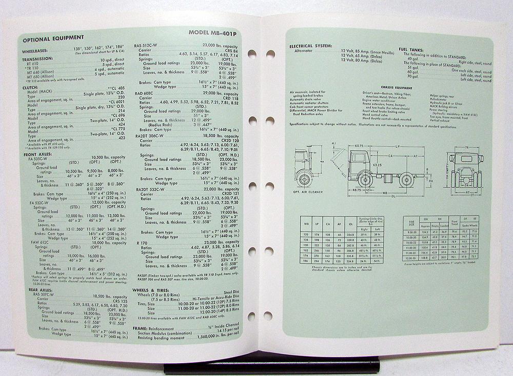 1974 Mack Truck Model MB-401P Specification Sheet.