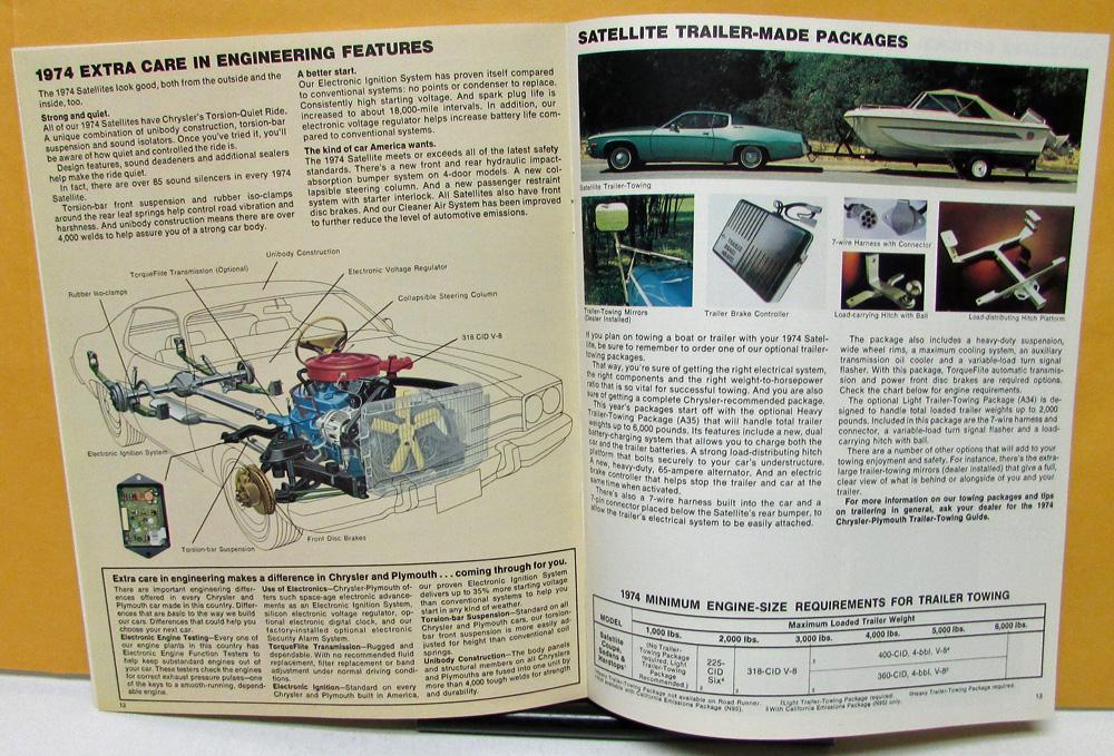 Original 1974 Plymouth Satellite, color, sales brochure featuring the styles: Sebring-Plus, Sebring, Custom Sedan, Sedan, Coupe, and Road Runner. Lots of interior and exterior photos, read about features, styling, engineering features, trailer-made packages, options, colors, and standard features.