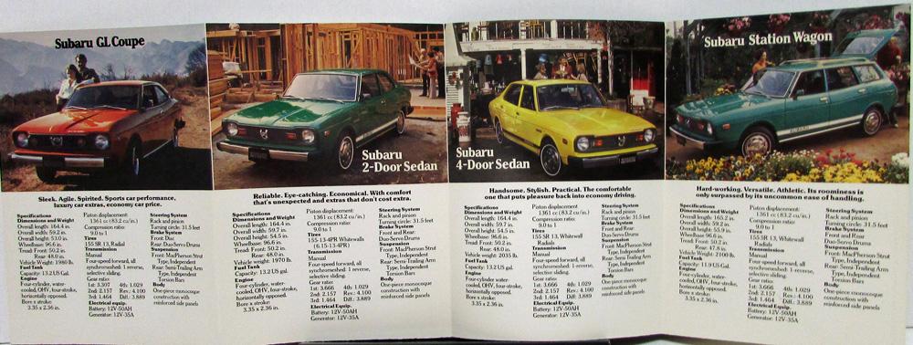 Original, color, sales folder/MAILER for the 1974 Subaru listing standard features, specifications, and dimensions for the GL Coupe, 2-door sedan, 4-door sedan, and station wagon. Very good condition. Two-sided color printing on one sheet of paper with three folds.