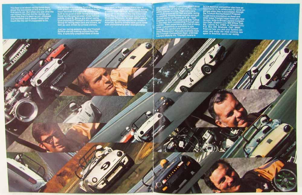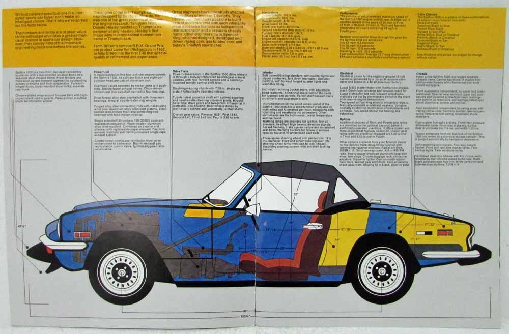 1974 Triumph Spitfire Sales Brochure. What is a sports car for? The question is most often asked by people who have never driven one. They wonder what earthly reason there could be for having a car with only two seats, a car so low tht you can easily reach out an open door and touch the ground. A sports car like the Spitfire 1500 is for tasting the road as you would a fine wine. It is for eliminating the routine drives and the journesy that are commonplace. A spors car is a first car, a second car or a third car. A Spitfire fills the happy corner of your garage. It is a reason for traveling as well as a means of travel. Hightlights many of the features of the car and gives specifications and a cutout displays several items under the skin of the Spitfire. Towards the back highlights Triumph's racing success.