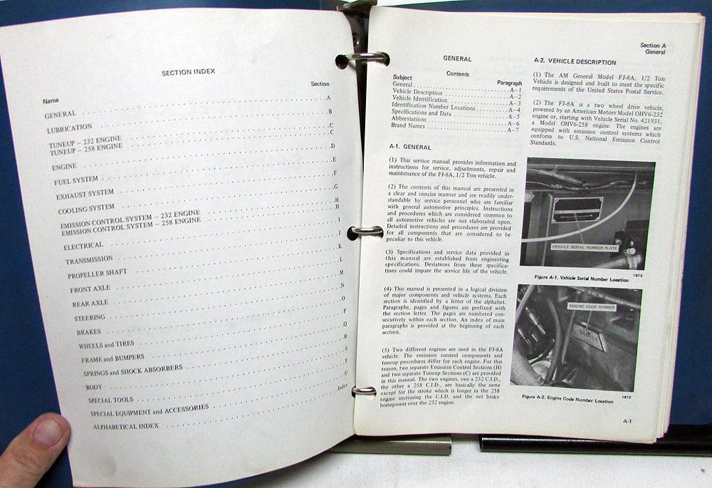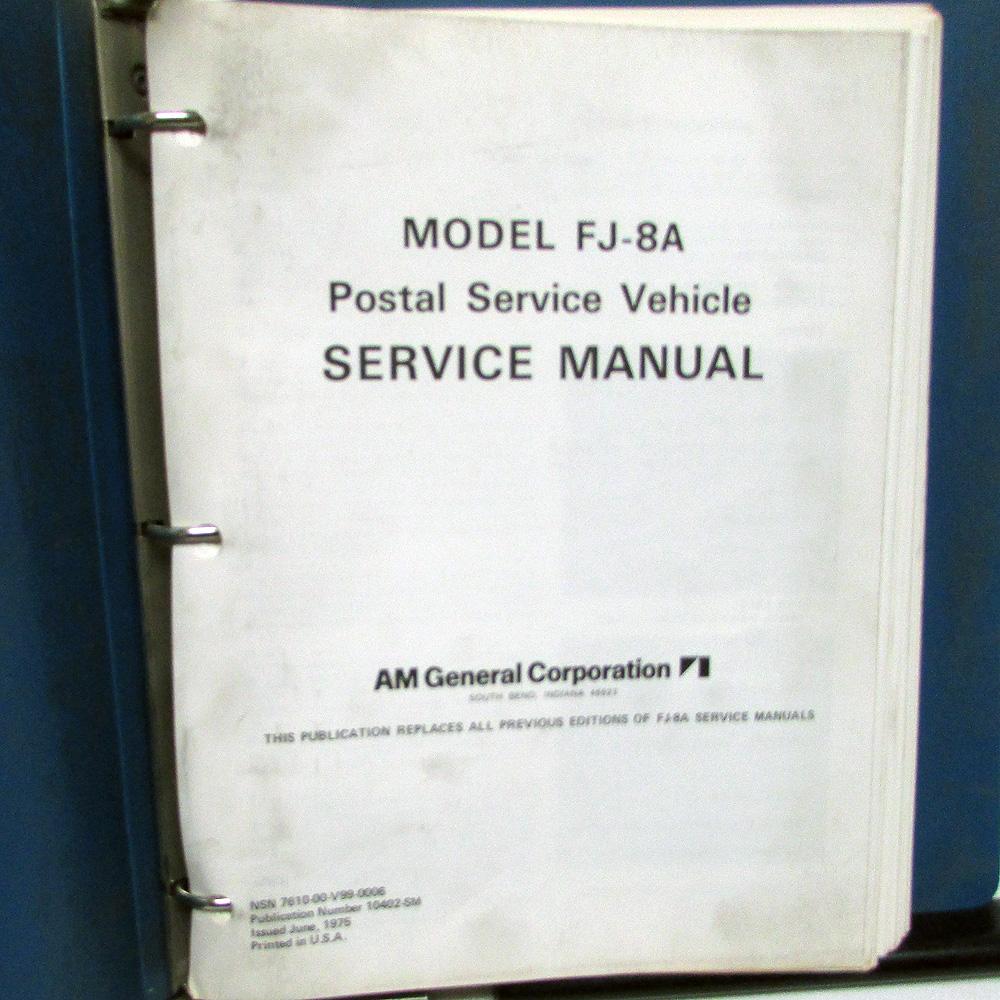 1975 AM General FJ-8A Service Manual. This Jeep Model FJ-8A Shop Manual [dated June, 1975] was used to Service and Repair these Postal Service Delivery Vehicles. It has Information, Specifications, Trouble-Shooting, Procedures and Illustrations to aid in the Repair of these Jeeps. It is in good condition with minor wear and soiling [see photos]. Very hard to find and informative Manual with original hard Binder.