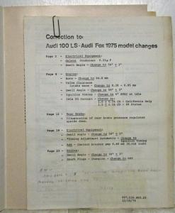 1975 Audi 100 LS - Audi Fox Model Changes Service Information Brochure with Extra Pages. Original.