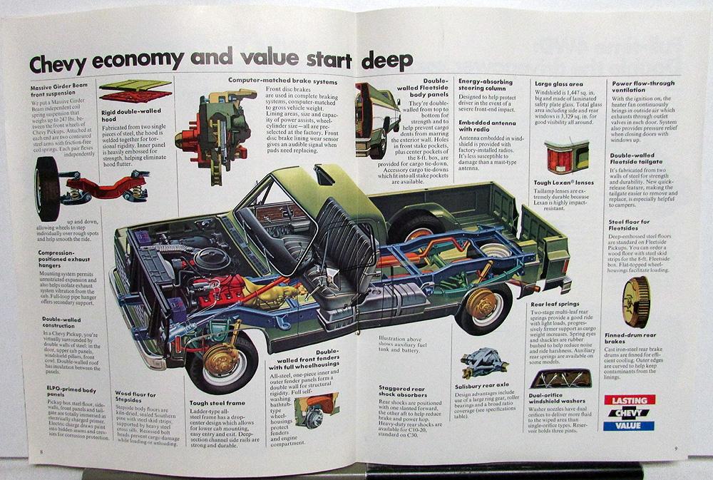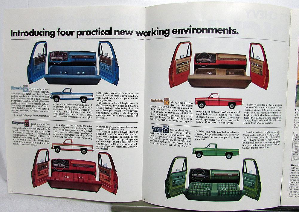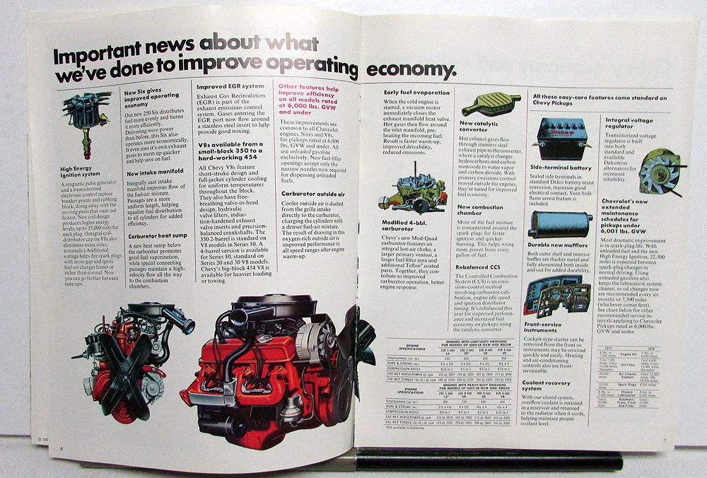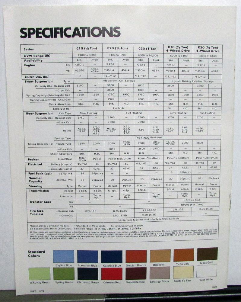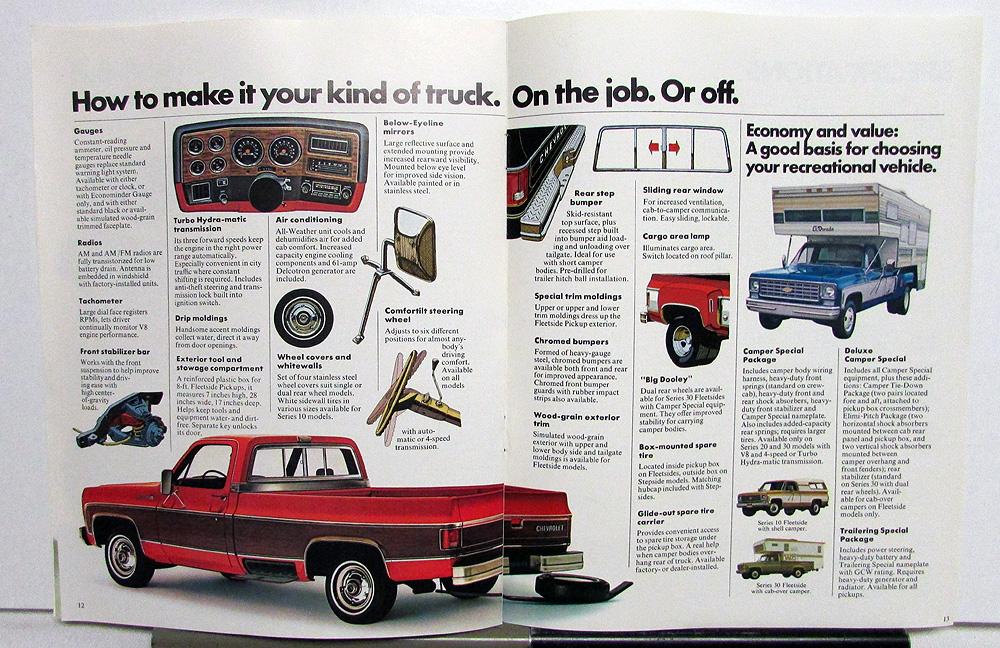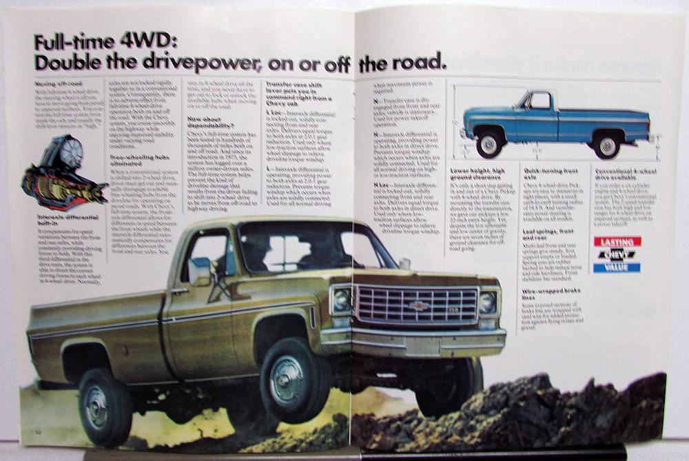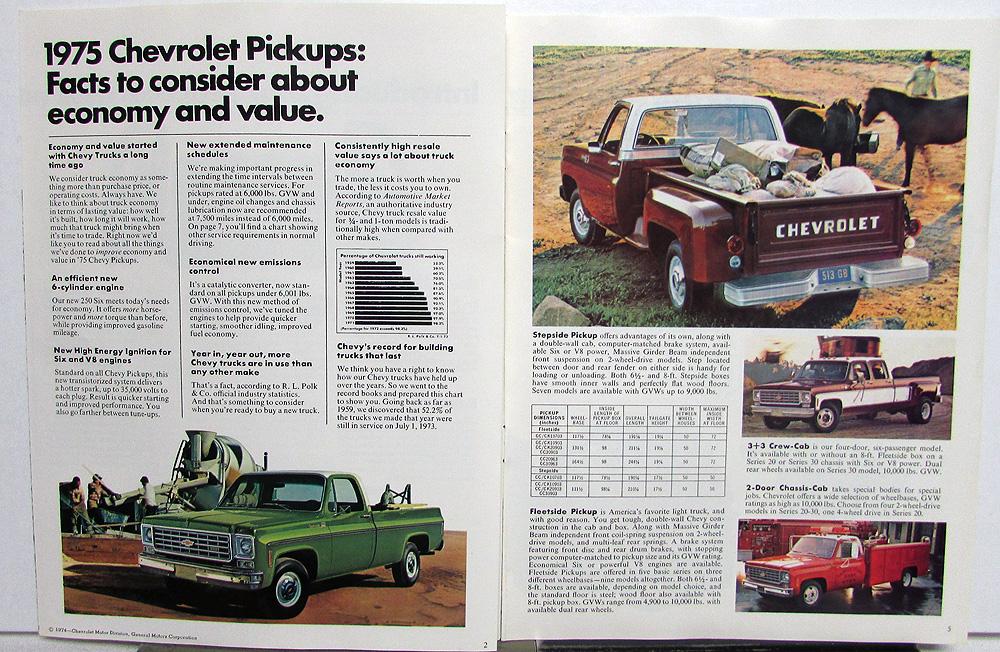 Nice original 1975 Chevrolet Truck Dealer Sales Brochure. This well-illustrated Brochure shows the Features and Specifications of the Pickup Models that were available from Chevy . Very rare and informative piece of automotive history that will display well. 3020 Sept. 1974