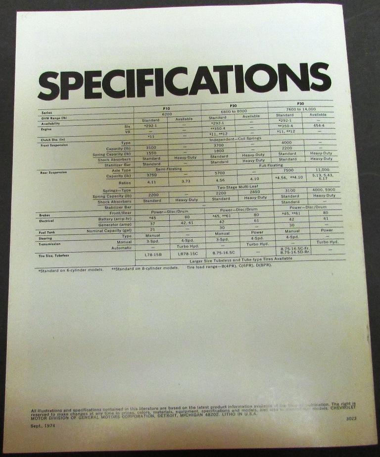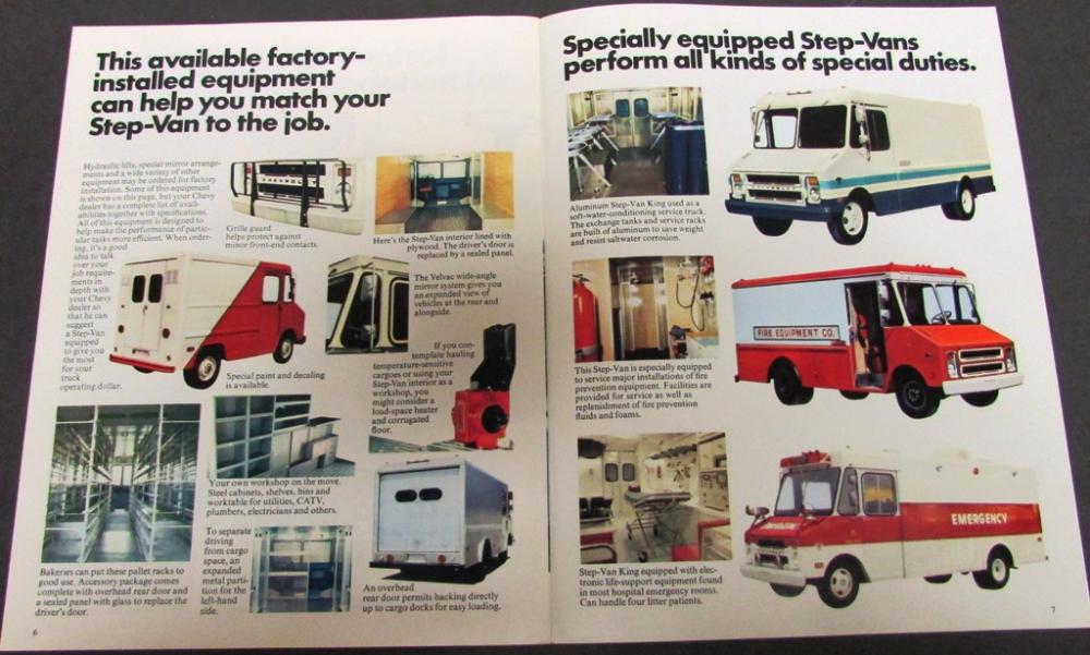 Nice original 1975 Chevrolet Truck Dealer Sales Brochure. This well illustrated Brochure shows the Features and Specifications of the Step-Van Models that were available from Chevy. Very rare and informative piece of automotive history that will display well.
