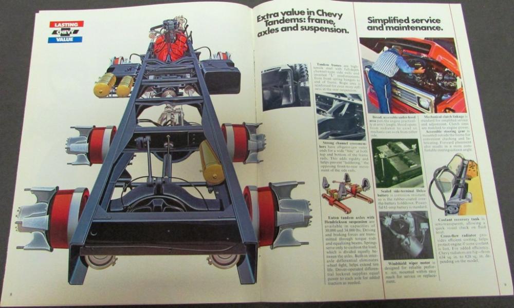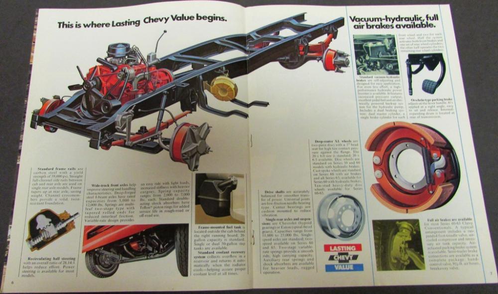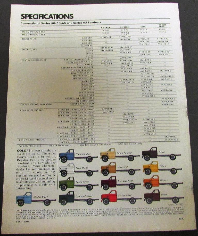 Nice original 1975 Chevrolet Truck Dealer Sales Brochure. This well illustrated Brochure shows the Features and Specifications of the Conventional Cab Series 50-60-65 Truck Models that were available from Chevy. Very rare and informative piece of automotive history that will display well.
