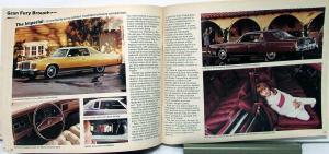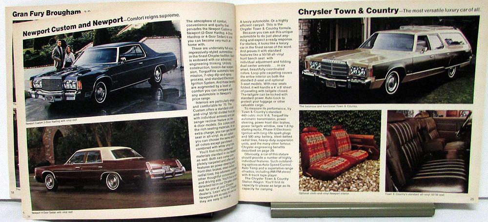 Original, Chrysler-Plymouth color, sales brochure, full line including Road Runner and Duster. Includes Voyager, Trail Duster, Cordoba, Duster, Valiant, New Yorker, Imperial, Gran Fury, Fury Sport, Town & Country and more. Lots of style photos with text, with exterior and interior dimensions. Popular features and options. Back cover has a color chart. Good condition.