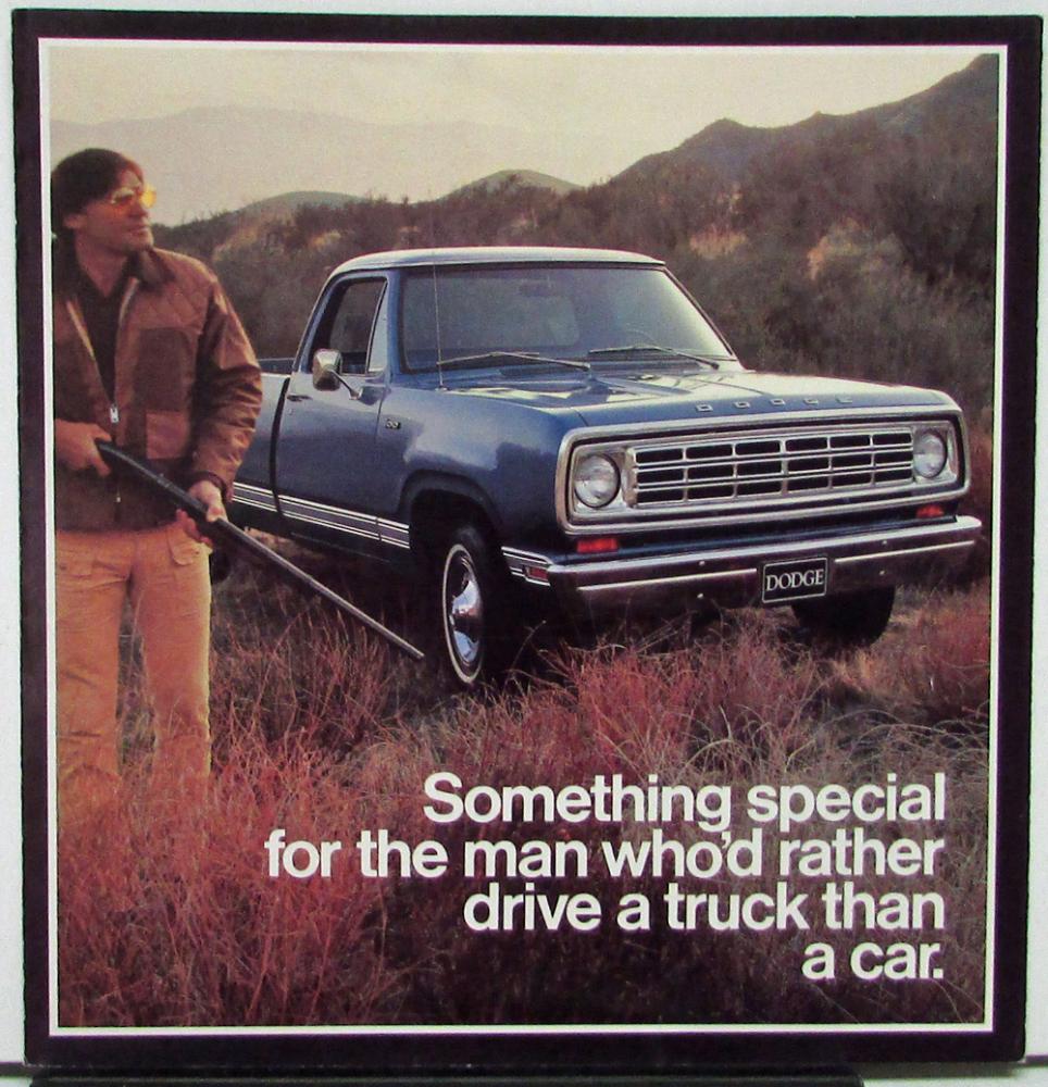 Original 1975 Dodge full line of trucks sales brochure, color, with graduating page index. Covers pickups, vans and wagons, medium-duty and heavy-duty models, recreational vehicles, and Ramcharger models. Clean, very good condition. No specs. There is a small paper blemish on the back outside cover, right side.