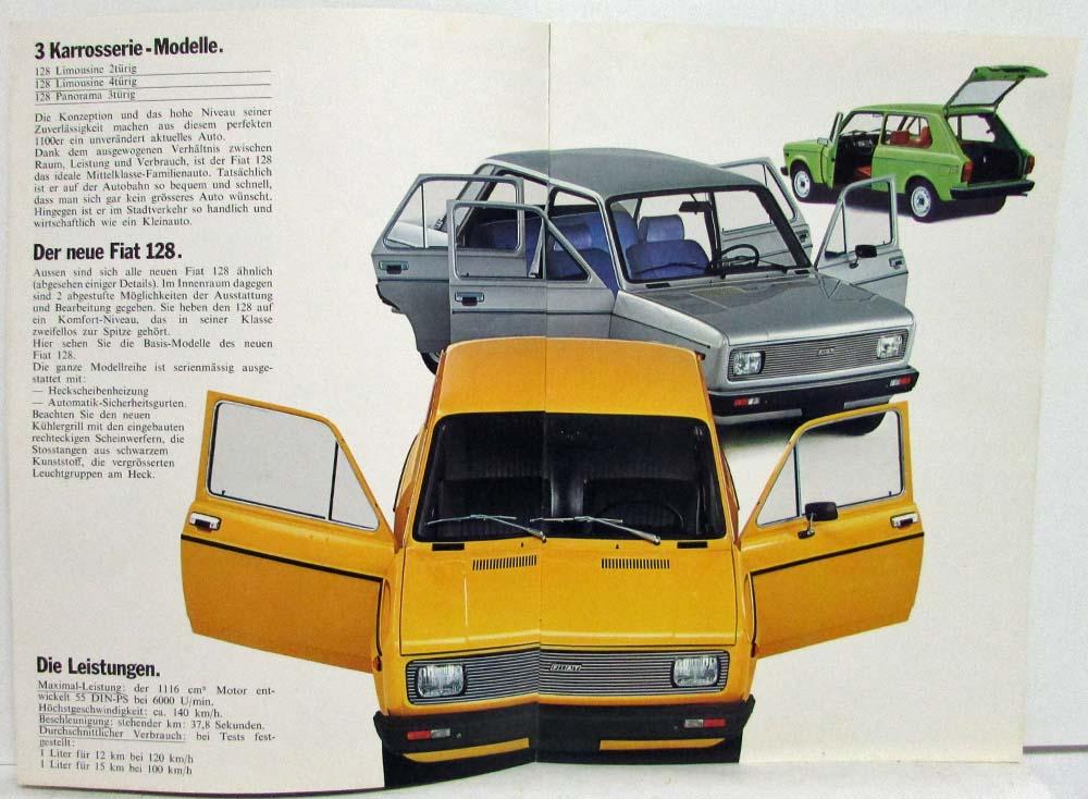 Der neue Fiat 128. Die zeitgemasse Formel. Vorderradantrieb, Einzelraduafhangung rundum, Scheibenbremsen vorn, Servobremse, Bremskraftregler, Radialreifen, samtlichen modernsten Sicherheitseinrichtungen. Wer heutzutage ein modernes Auto der 1100er Kategorie bauen will, muss dieses Konzept ubernehmen. Dank jahrelanger Bewahrung bietet heute der neue Fiat 128 aussergewohnliche Zuverlassigkeit.
