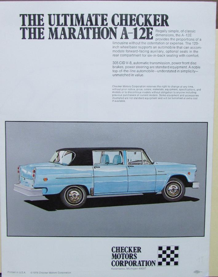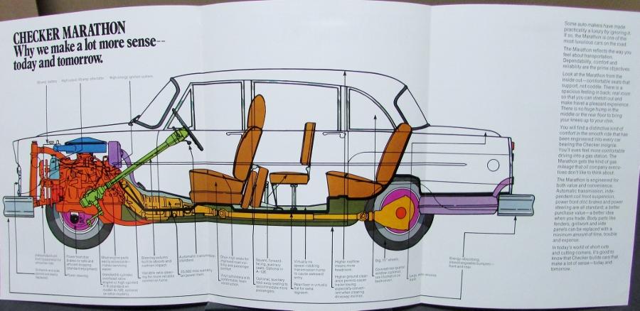 1976 1977 ? original, color, sales brochure/folder for the Checker Marathon with colorful diagram of chassis, and inset illustrations of functunality of the interior.