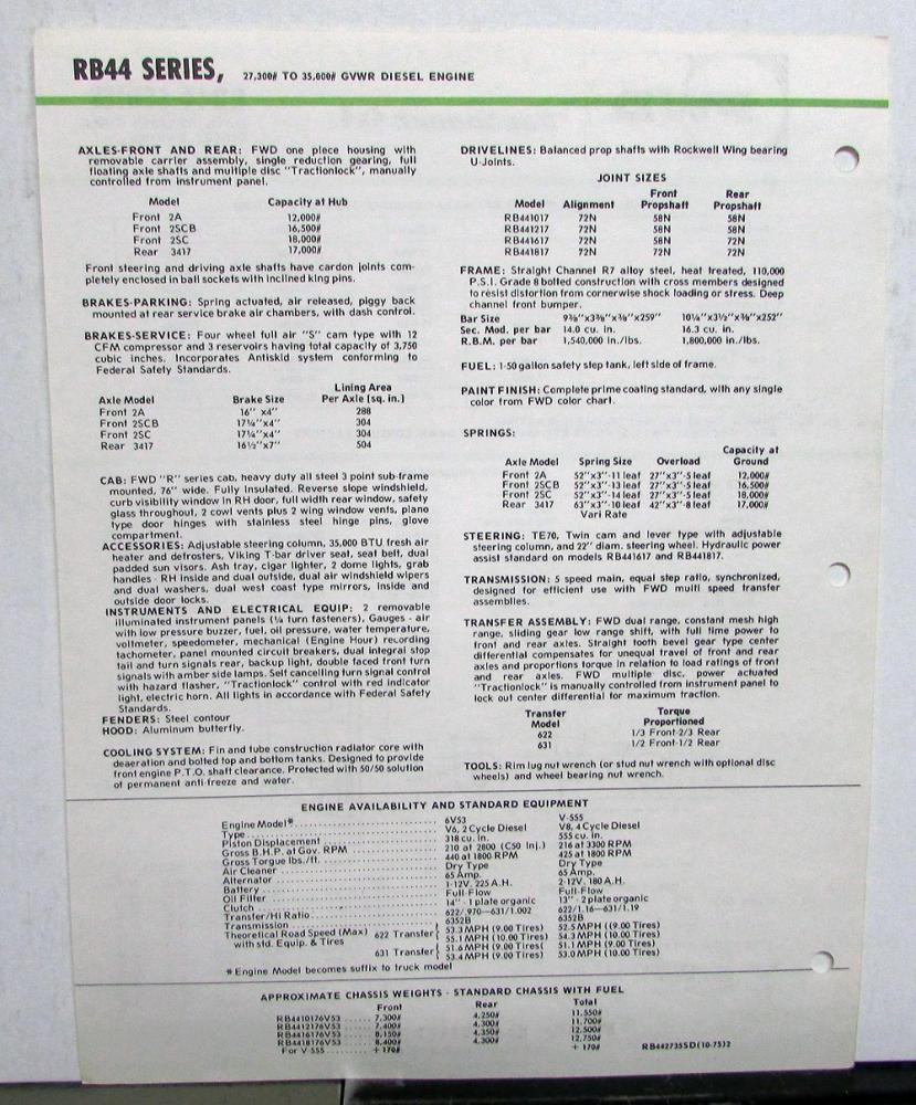 Original 1976 FWD Trucks Tractioneer 4X4 RB44 Series Diesel Engine 27300# to 35,000# GVWR Dealer Specifications 2-sided Sheet. Good condition with minor wear.