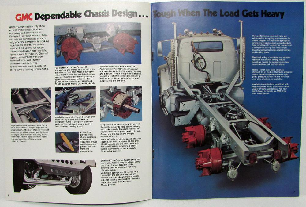 1976 GMC 9500 Conventional Sales Brochure. GMC 9500...Road proven reliability. GMC 92" and 114" BBC short and long conventionals offer owners and drivers reliability of a design in over-the-highway tractor and straight truck applications. A broad range of available engine and driveline combinations deliver the power and gearing needed for most applications. Single and tandem axle short conventional models with 92" BBC permit long trailers, good maneuverability. Tandem axle 114" conventionals are tailored for hauling in bridge formula states. Rugged cab construction value designed for years of strenuous service. GMC home on the road. GMC dependable chassis design...tough when the load gets heavy. GMC durability and serviceability. GMC engines that deliver power and operating economy. Technical information for single and tandem axle models. Back has dealer-installed accessories and available equipment. Condition: Good, clean. Rusty staples. ADV 76-13 (8-75)