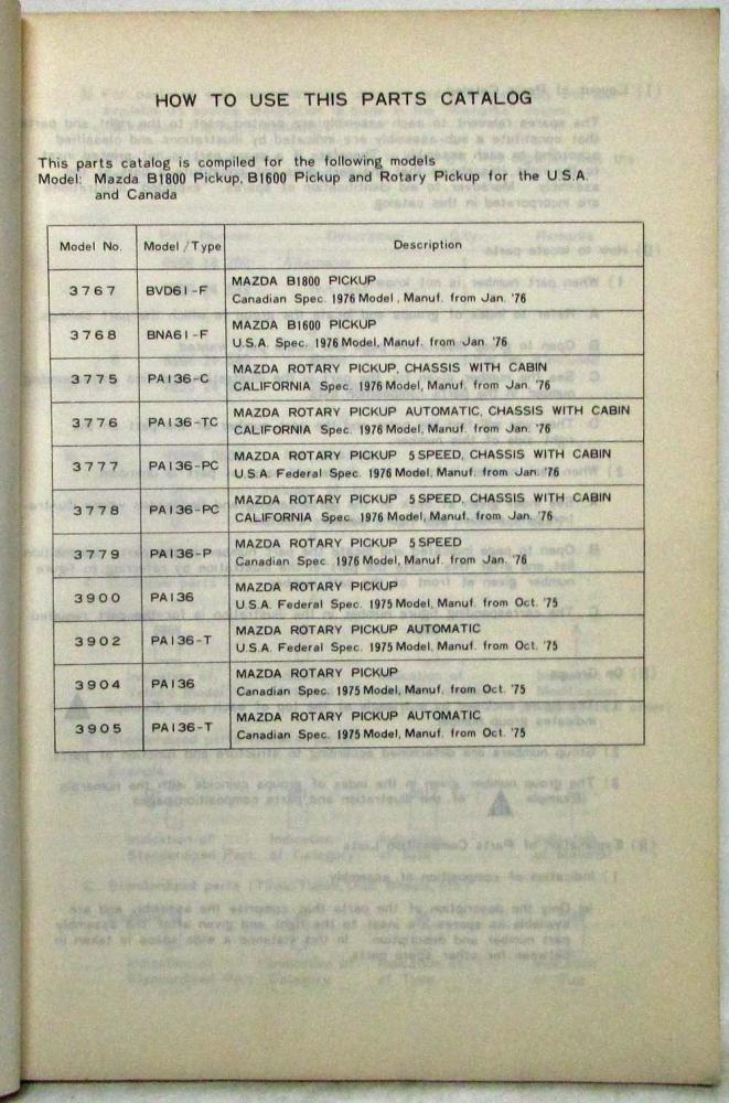 Compiled for the following models: Mazda B1800 Pickup, B1600 Pickup and Rotary Pickup for USA & Canada.