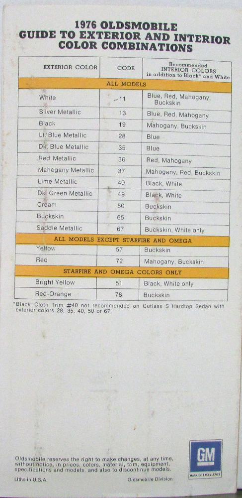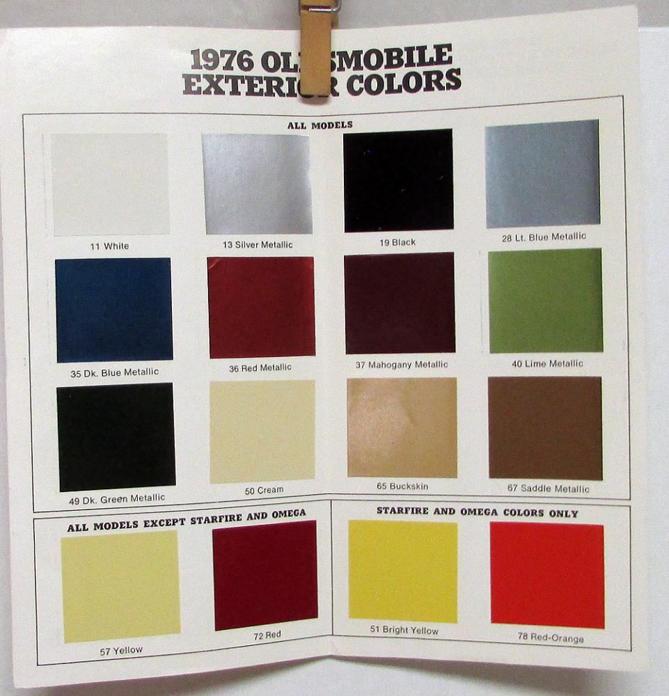 Original, two-sided sales folder with paint chips for the 1976 Oldsmobile exterior colors. Includes exclusive colors for the Omega & Starfire. Back side has list of exterior and interior color combinations. Paint chips in very good condition. Outside cover is very lightly worn.