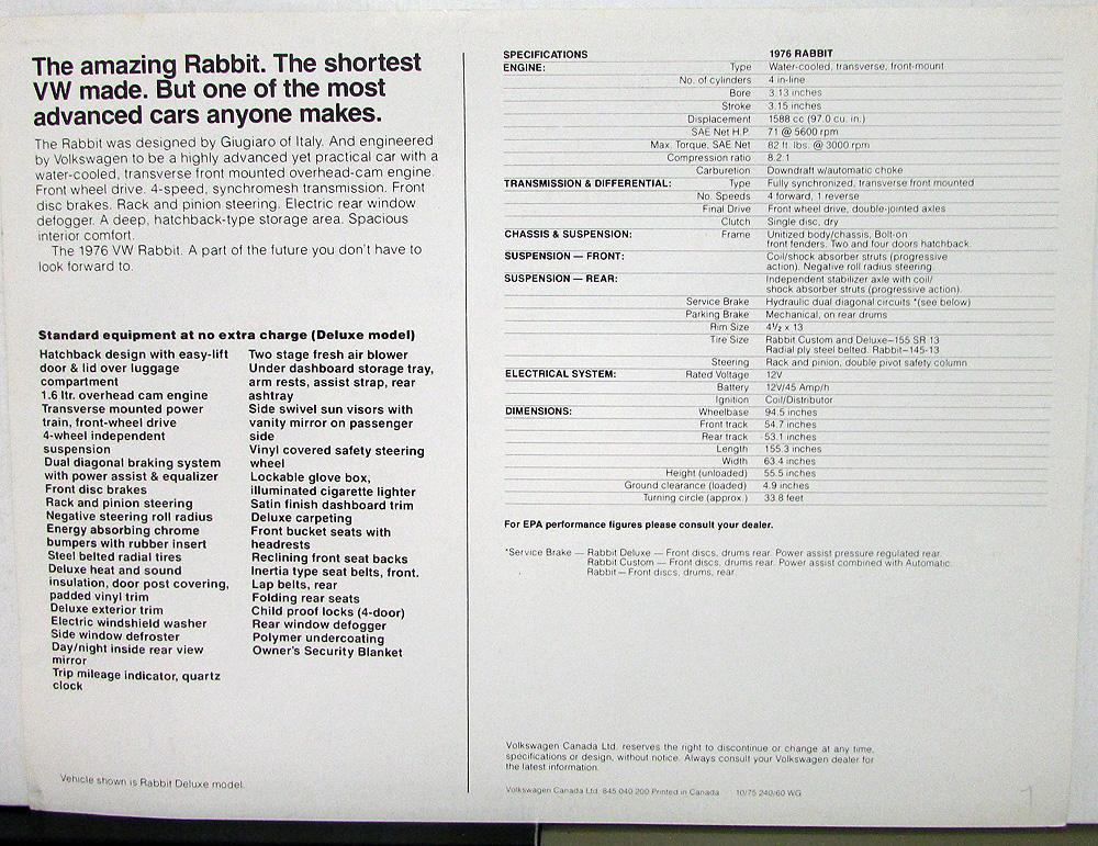 Original, color, sales data sheet for the 1976 Volkswagen Rabbit (including deluxe and custom) passenger car. List of standard equipment and specifications are on side two. Printed in Canada.