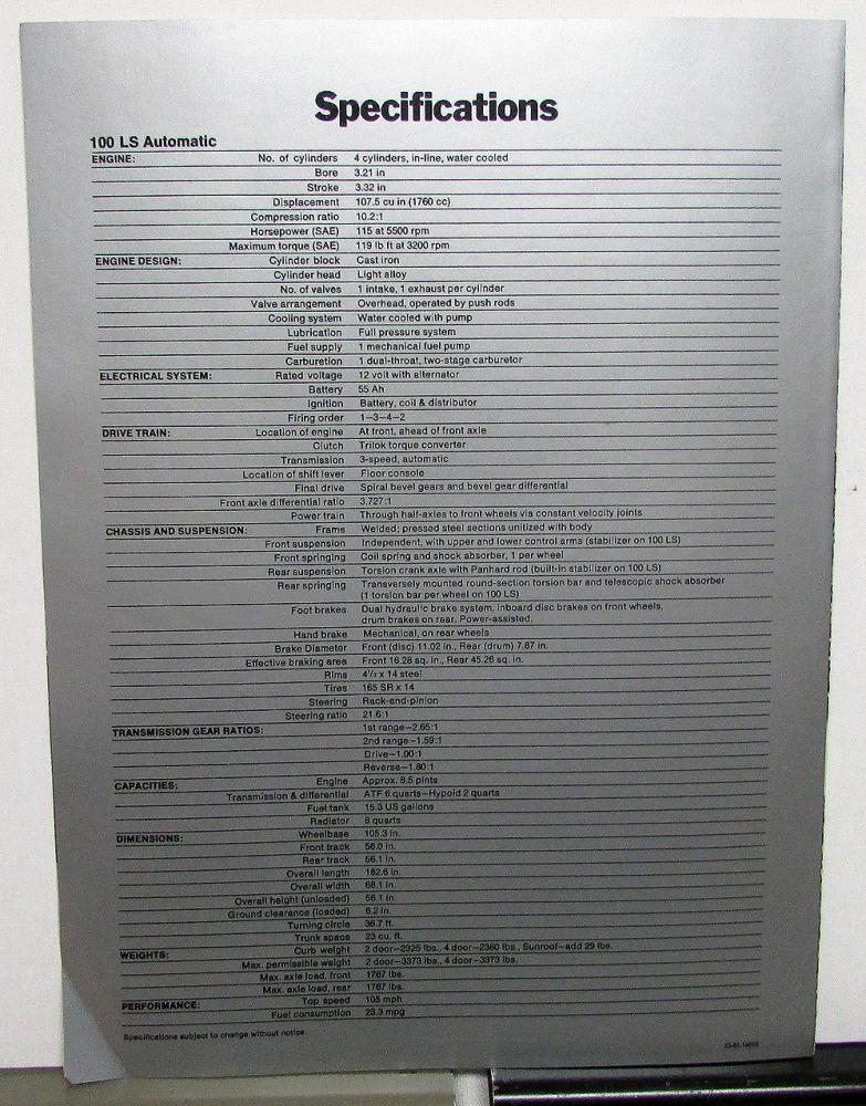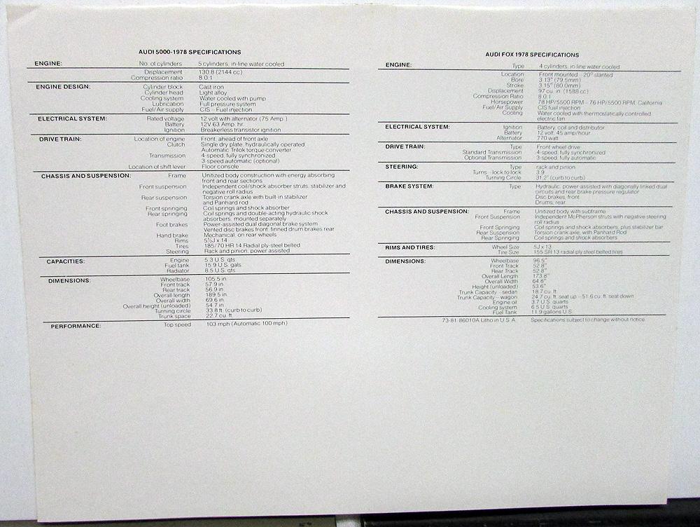 Original pair of Audi Dealer Sales Brochures. First is a 1977 Audi 100 LS large Folder with Features and Specs. The other is a 1978 Folder for the Audi 5000 and Fox Models. Both are in good condition with minor wear and blemishing [see photos].