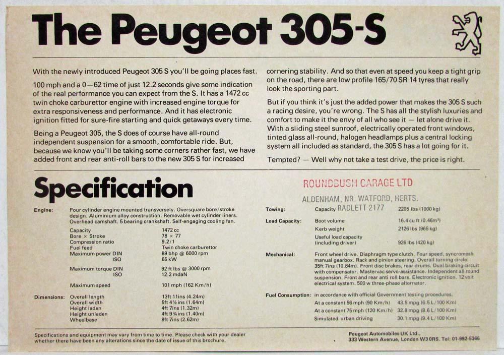 1977-1982? Peugeot 305-S New 100mph Spec Sheet.