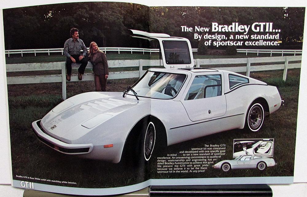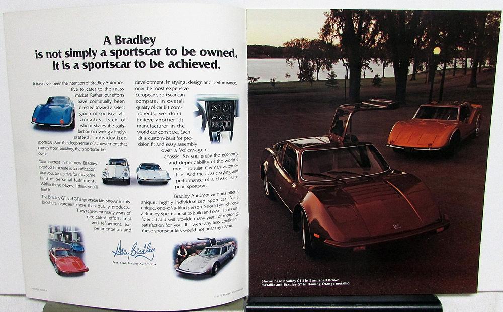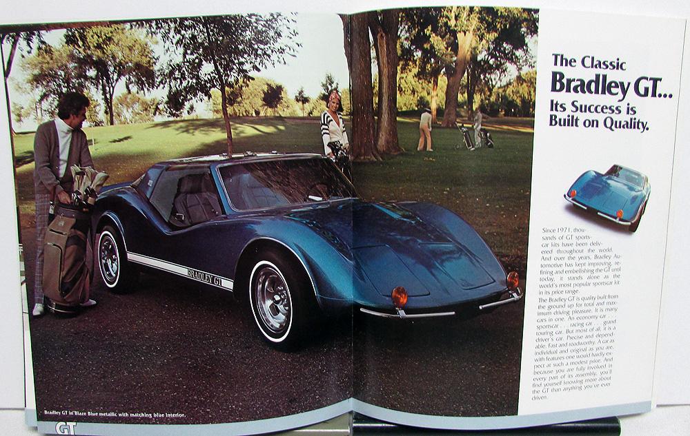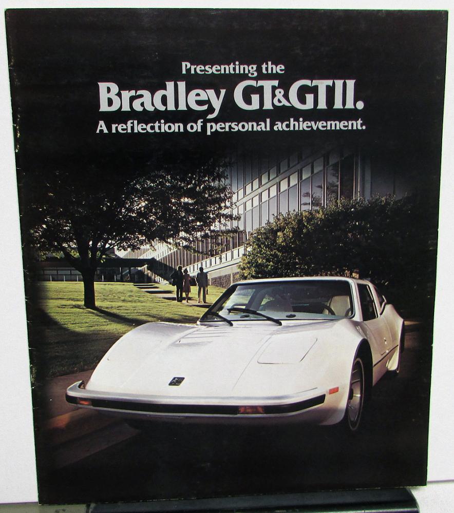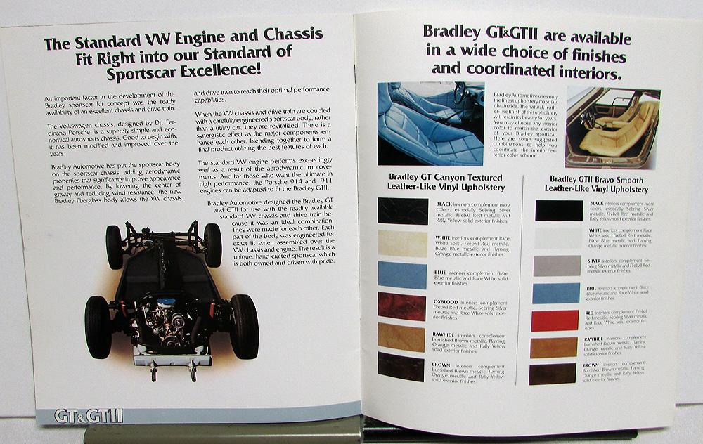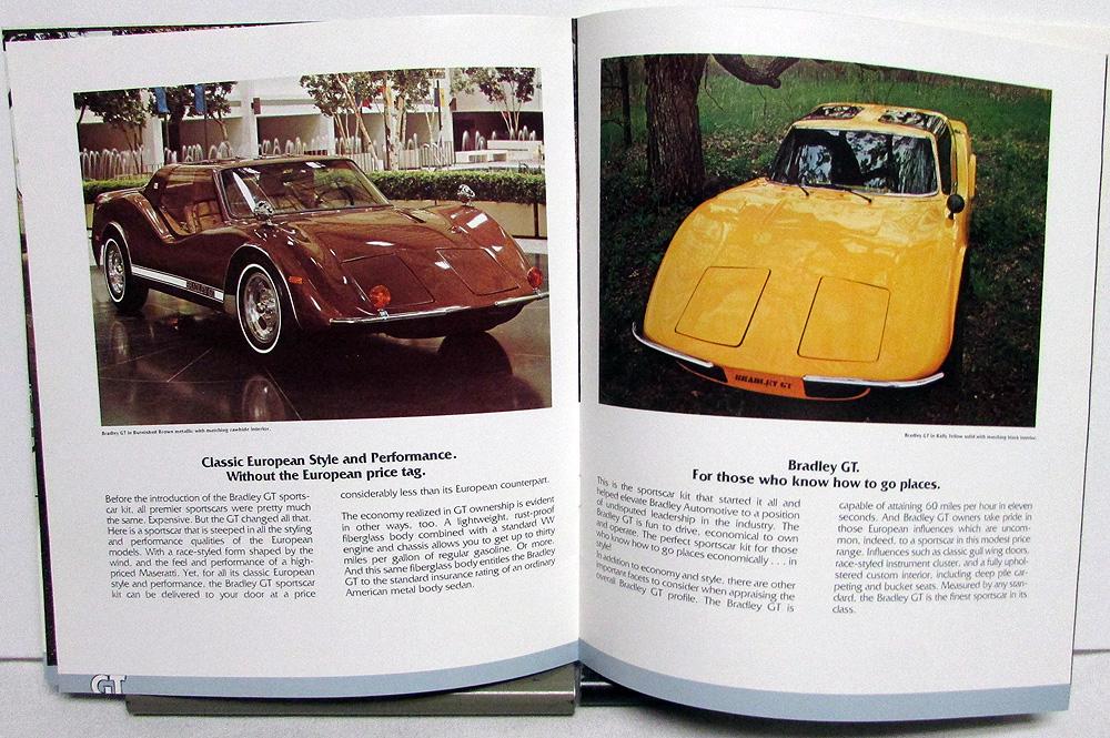 1977 Bradley GT & GT II color, original, sales brochure with sharp color photos. Includes inset photos of standard features and executive options. Chart of interior colors. Copywrite date 1977. Color chart of Canyon textured leather-like vinyl upholstery, and Bravo smooth leather-like vinyl upholstery. Very good condition with minor wear and soiling [see photos].